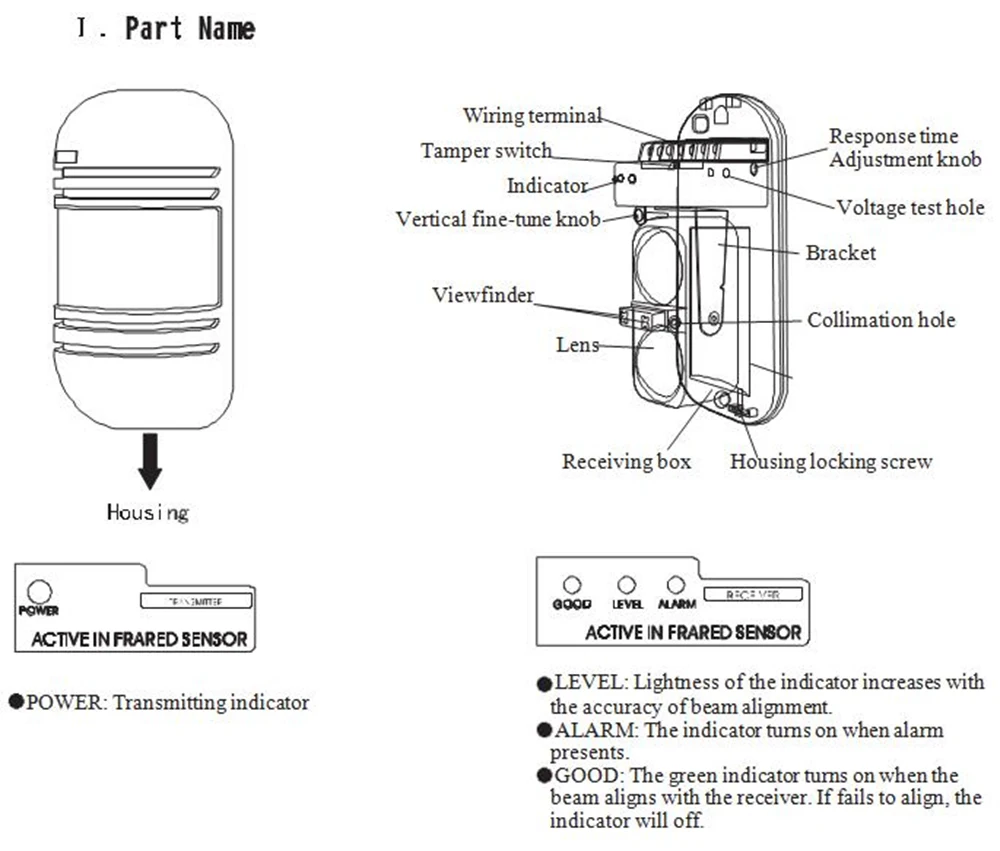 Инфракрасное расстояние передачи составляет 20-150 м Светильник-источник: Инфракрасный цифровой импульсный Скорость отклика: 50-700 м/с Выход сигнала тревоги-нормальное: нормальное закрытие и нормальное открытие (NC & NO), емкость контактных точек, AC/DC30V 0.5mA Макс. Рабочее напряжение: 12-24 В постоянного тока, 10-18 В переменного тока Рабочая температура: -25 °C-55 °C Рабочая влажность: 5%-95% (RH) Выход ТАМПЕРА: выход контактной точки NC, емкость DC 24V 0,5 Amax Регулируемый по горизонтали угол: 180 °(± 90 °) Регулируемый по вертикали угол: 20 ° ± 10 °