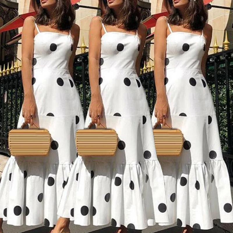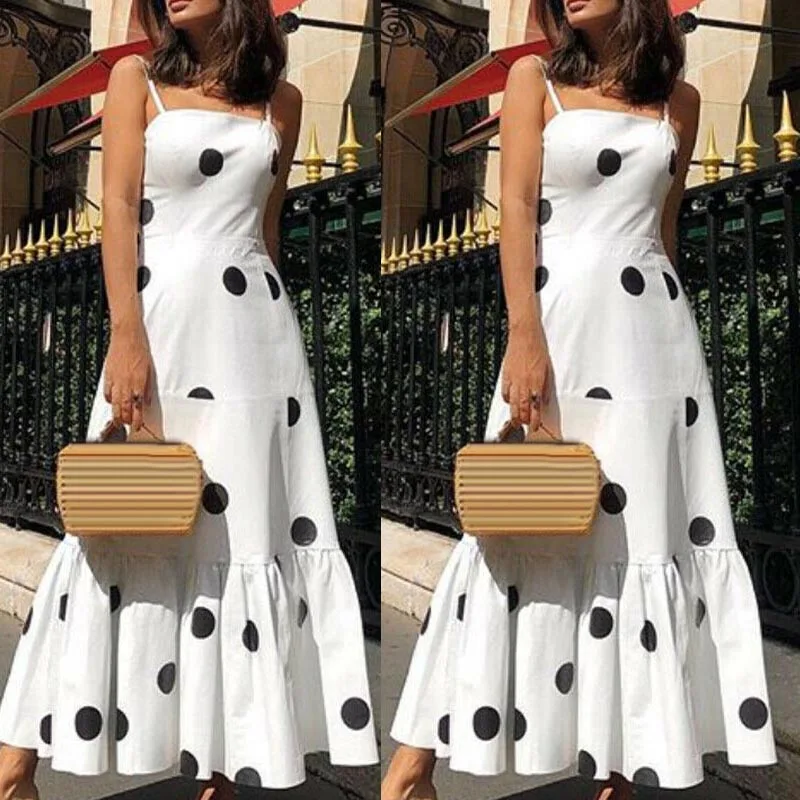 * Описание товара: узор в горошек, ремень без рукавов, длинное платье