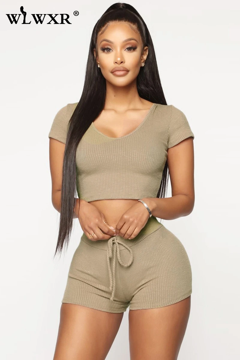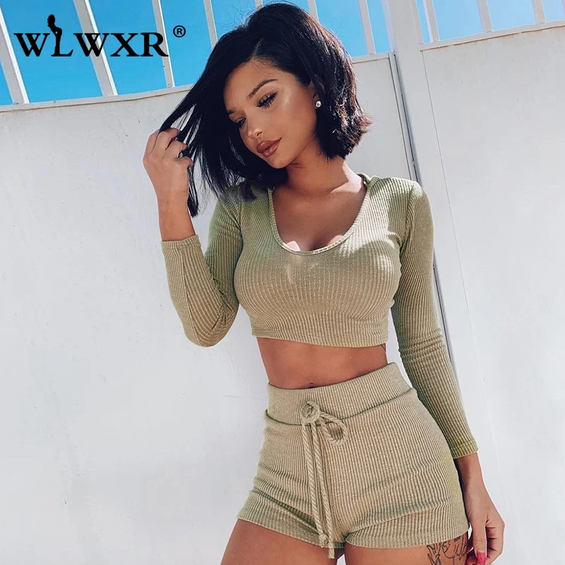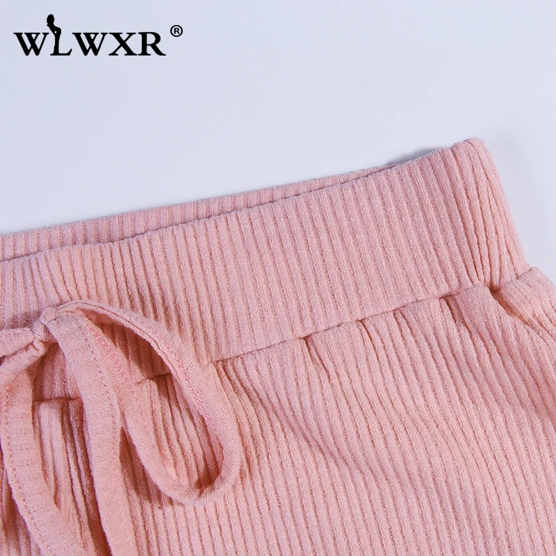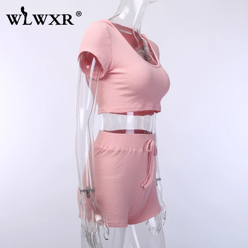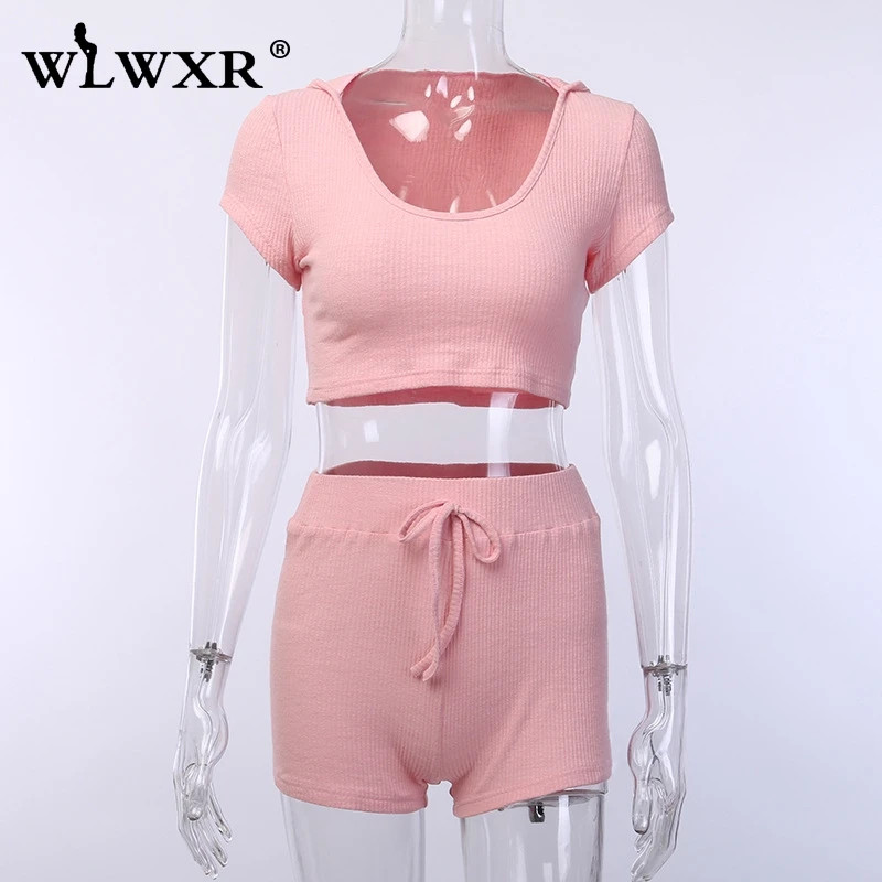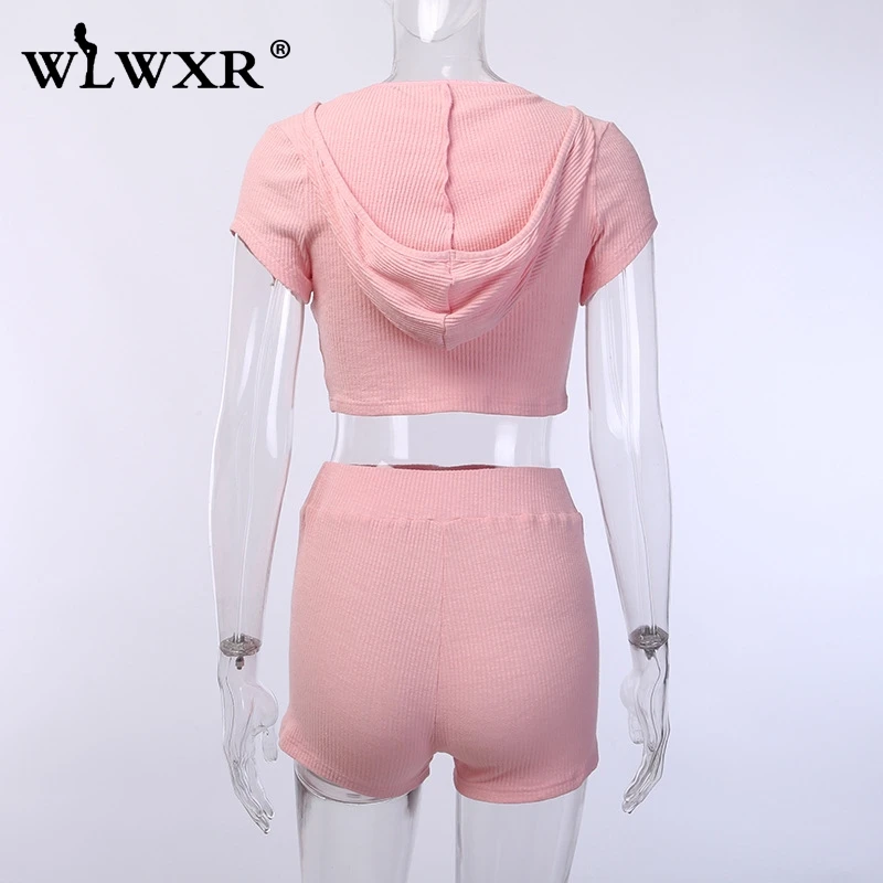 WLWXR уличная одежда ребристый вязаный летний комплект из 2 предметов женская одежда розовый сексуальный укороченный топ с капюшоном и шорты женский костюм комплект