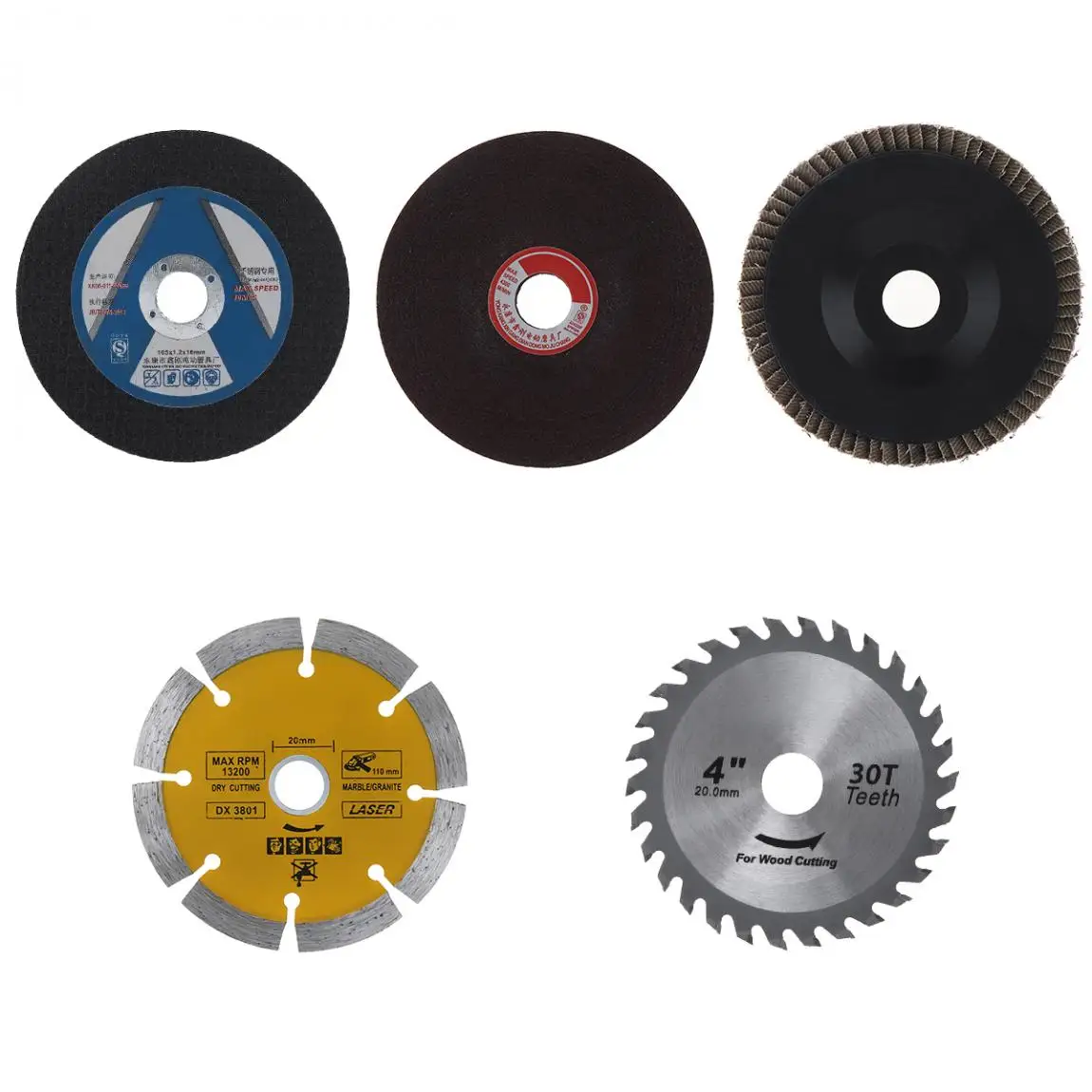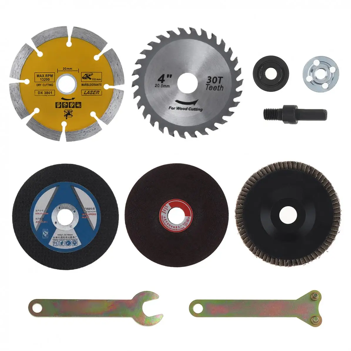 8pcs Tools includes: Transfer shaft, Marble tablets,Grinding wheel, Cutting wheel, Platen, Alloy saw blade, Flap disc, Wrench.