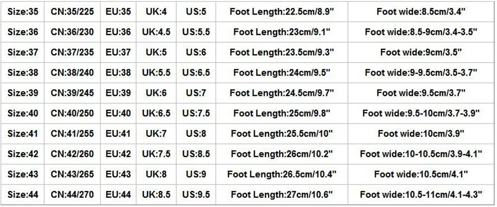 | Размер | CN | ЕС | Великобритания | США | Длина стопы | Широкая стопа |