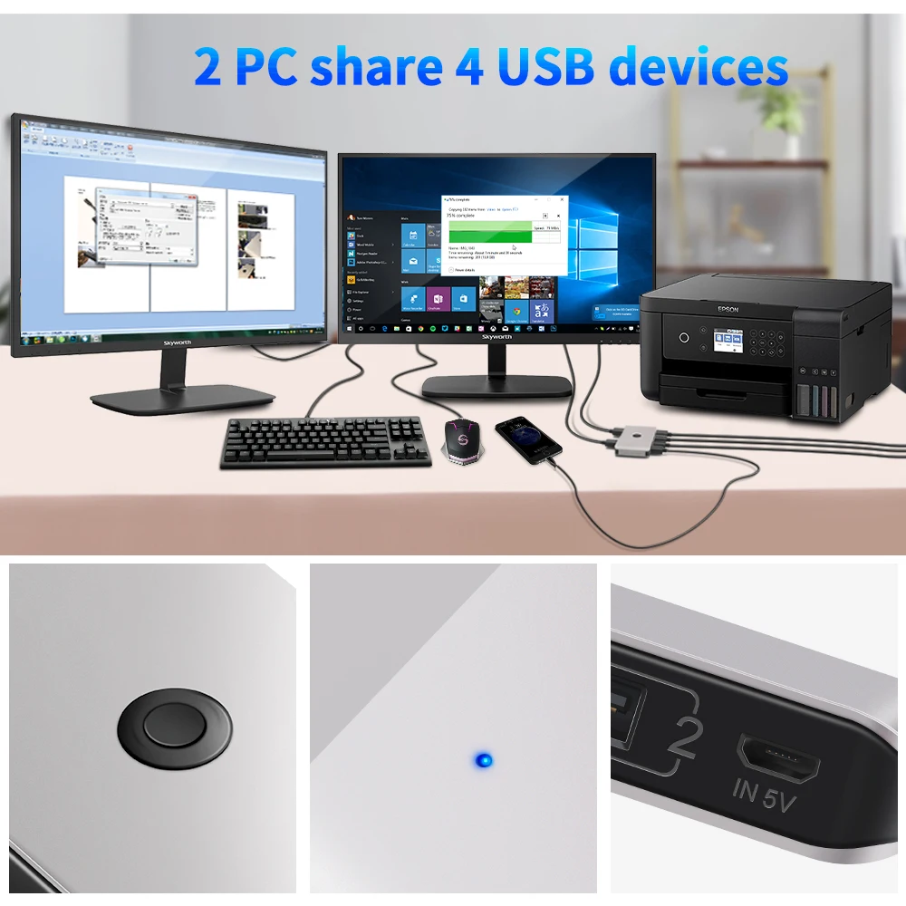 Rocketek USB Switch, USB Sharing Switch for 2 Computers sharing 4 USB 2.0 Ports, KVM Switches for PCs with One-Button Swapping and 2 Pack USB Cable 【USB Sharing Hub】One button swapping between 2 computers. Convenient & efficient, 2 computers share 4 USB devices, plug and play. 【2 USB Input 4 USB Output】Keyboard, mouse,USB printer, scanner, curve plotter, multifunction printer, Bluetooth equipment and other USB devices can be used with 2 computers which saves money and time. 【5V DC Power Supply Port 】Devices like HDD and Digital Video Cameras might need external power to running. Please make sure use Standard 5V Adapter for powering while using high power device. 【Great Compatibility】Plug and play for Windows 10/8.1/7/Vista/XP and Mac OS X, Linux and Chrome OS.