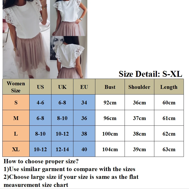 Material:Lace+Chiffon Package included: 1x T-ShirtSize Chart: