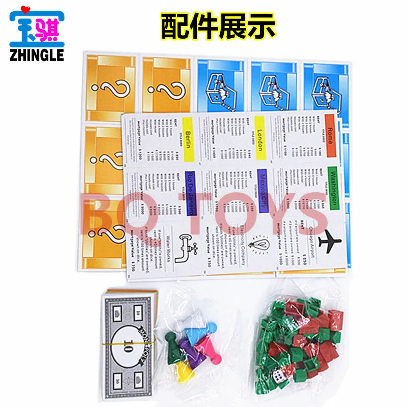 Название: Английский Монополия Упаковка: цветная коробка [Количество игроков]: 2-8 человек (Монополия) [Подходит для возраста]: 8 лет или старше [Материал продукта]: пластик, бумажная версия [Размер шахматной доски]: около 42*42 см Характеристики продукта: шахматная доска-это квадратная жесткая бумажная версия, шахматная доска складывается, легко переносится при путешествиях, нет места, доступная, и печатный узор шахматной доски является изысканным.