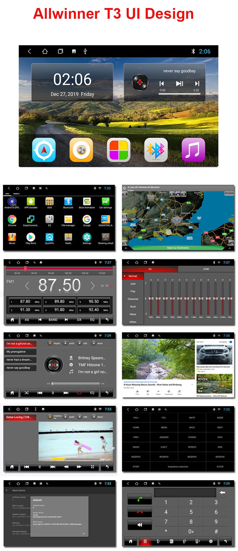 Посылка: 1. Автомобильный плеер * 1 2. Кабель RCA * 1 3.GPS антенна * 1 4. Задний USB кабель * 2 1. Размер экрана: 10 дюймов 2.5D цифровой сенсорный экран, Ips-экран с разрешением 1024*600 2. 4G WIFI версия: ОС Android 9,0, 2 Гб ОЗУ 32 Гб ПЗУ Поддержка беспроводной сети 4G Четырехъядерный процессор MT8003®1,3 ~ 1,5 ГГц Cortex-A7 3. Версия WIFI: ОС Android 8,1, 1 ГБ ОЗУ 16 Гб ПЗУ Четырехъядерный процессор Allwinner T3®1,3 ~ 1,5 ГГц Cortex-A7 Беспроводная сеть Поддержка 4G (опционально) и Wi-Fi обеспечивает вам больше развлечений 4. Радио Поддержка RDS Радиомодуль: NXP6686 Частотный диапазон AM: 522-1620 кГц Приращение AM: 9 кГц (ЕС)/10 кГц (США) Диапазон настройки FM: 87,5-108 МГц FM Увеличение: 0,05 МГц (ЕС)/0,1 МГц (по ТИХООКЕАНСКОМУ летнему времени США) FM область: Европа/USA1/USA2/Япония/Россия Предустановленные станции: 30(FM 3*6, AM 2*6) 5. Аудио: Формат: MP3/WMA/MP2/OGG/AAC/MA4/FLAC/APE/WAV и т. д. можно играть через список песен Запись: MP3, WMA Другое: синхронный дисплей LRC; Поиск ID3; Поиск по файлам; Изображение альбома; Пользовательский звуковой эффект Аудио IC: Top Global Cirrus IC, независимое декодирование аудио SNR: шумовые пайки: = 90 дБ 6. Вход/выход Премиум усилитель TDA 7851 Выходная мощность аудио: 4*50 Вт Поддержка входа камеры заднего вида и управления обратным пусковым устройством 1 видео вход маршрута 2 маршрута аудио вход 4 канала аудиовыхода 1 выход сабвуфера маршрута 7. Язык OSD: Русский, английский, испанский, итальянский, французский, немецкий, китайский, эстонский, польский, филиппинский, финский, корейский, голландский, хорватский, латышский, литовский, румынский, норвежский, португальский, японский, шведский, тайский, турецкий, украинский, венгерский 8. Зеркальная связь Встроенная простая функция. Для Iphone подключите его через точки доступа Wi-Fi Для Android мобильный телефон, подключите его через usb-кабель для передачи данных и точки доступа Wi-Fi. Изображение на мобильный телефон будет отображаться на DVD, также музыка, видео, игра Для мобильного телефона Android сенсорный экран DVD может управлять мобильным телефоном. (Обратите внимание: он может поддерживать часть мобильного телефона Android, не все из них) 9.Bluetooth: Свободные руки: Да A2DP (Bluetooth стерео музыка): Да, можно воспроизводить стерео музыку через Bluetooth Управление музыкой по Bluetooth: Да, воспроизведение/пауза/Предыдущий/следующий PB-Загрузка: Да, можно загрузить телефонную книгу с мобильного телефона на этот блок PB-поиск: Да, можно использовать первую букву для поиска контактного члена в PB-листингах Записи звонков: Да, звонки, пропущенные звонки Настройка: автоматический ответ, автоматическое подключение, имя устройства Встроенный микрофон: Да, на передней панели GPS: Поддержка карт: для IGO, Sygic, для Google Map и т. Д. Голосовое Руководство: Да Поддержка 2D/3D карты: Да Двойная зона: Да, навигация во время воспроизведения музыки Онлайн Navi: Да, поддержка онлайн навигации google maps Важные советы: Данное устройство не имеет движения DVD и не может воспроизводить DVD диски.