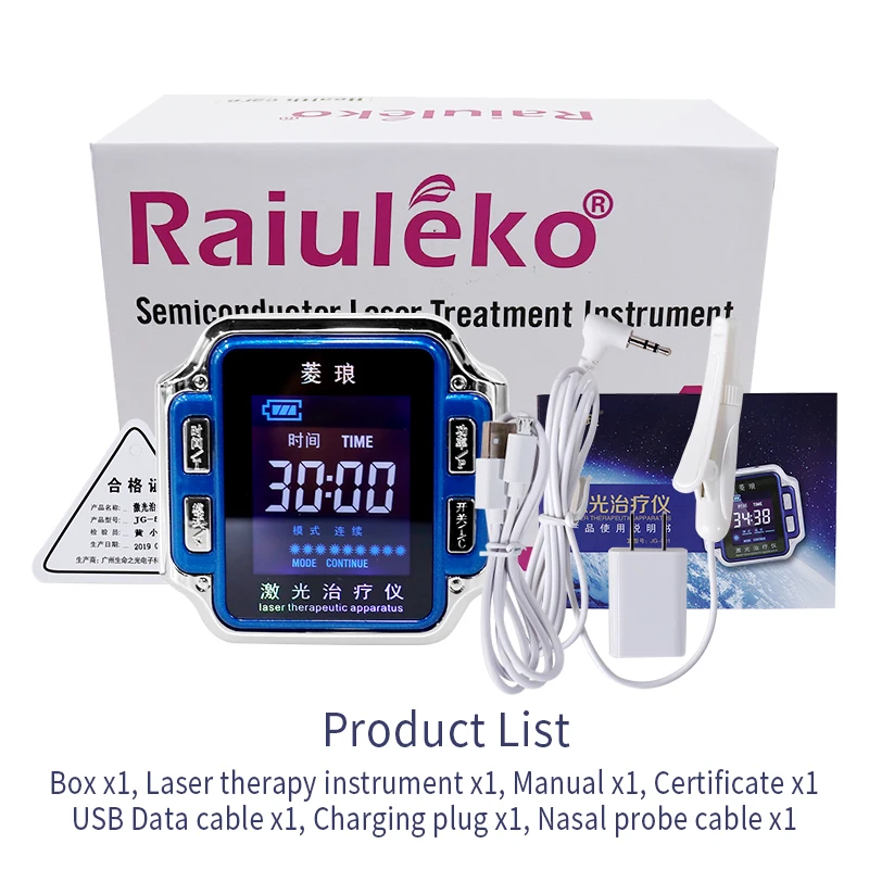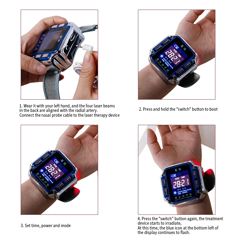 (1) правильно Носите устройство лазерной терапии (ношение в левой руке, четырехрядное лазерное окно на задней стороне выровнено с радиальной артерии), И подключите носовой зонд к устройству лазерной обработки.