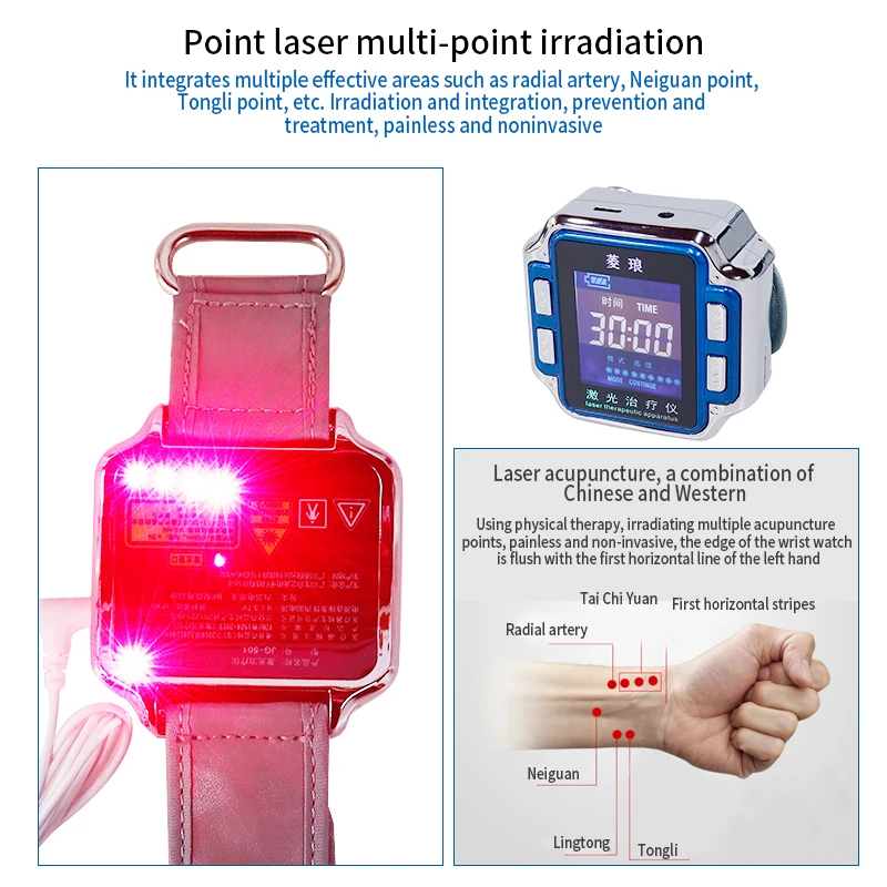 Этот продукт использует лазер низкой интенсивности с длиной волны 650 нм для облучения радиальной артерии, Neiguan, Lingdao и Tongli точек, и впрыскивает в кровь монохроматические фотоны с низкой энергией. Фотоны сочетаются с красными кровяными клетками и липопротеинами в крови. Таким образом, жировой слой, обернутый вокруг красных кровяных клеток, растворяется, способность вентиляции эффективно восстанавливается, а функция переноса кислорода в красных кровяных клетках улучшается. В то же время, поверхность покрытия красных кровяных клеток растворяется, отрицательный заряд на поверхности красных кровяных клеток восстанавливается, усиливается мутуалотталкивающая сила, И красные кровяные клетки оригинальной агрегированной группы рассеиваются; Молекулярная структура белка в крови также может быть изменена, и лазерное фотохимическое действие выполняется. Организм производит ряд биологических эффектов, которые могут эффективно снизить вязкость крови, снизить уровень триглицеридов в крови и снизить уровень холестерина в крови.