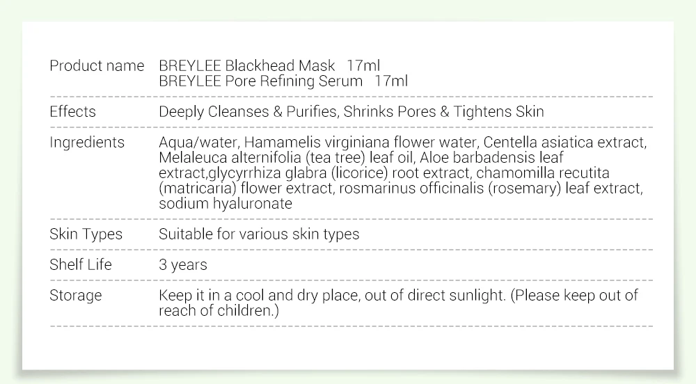 Название продукта: Маска для угрей BREYLEE 17 мл Сыворотка для рафинирования пор BREYLEE 17 мл эффекты: глубоко очищает, сужает поры, подтягивает кожу ингредиенты: Aqua/water, Hamamelis virginiana flower water, экстракт Centella asiatica, мелалеука alternifolia (чайное дерево) масло листьев, экстракт листьев алоэ barbadensis, экстракт корня глициррхиза глабра (солодки), хамомилла рекутита (matricaria) Экстракт цветка, экстракт листьев rosmarinus officinalis (розмарина), гиалуронат натрия