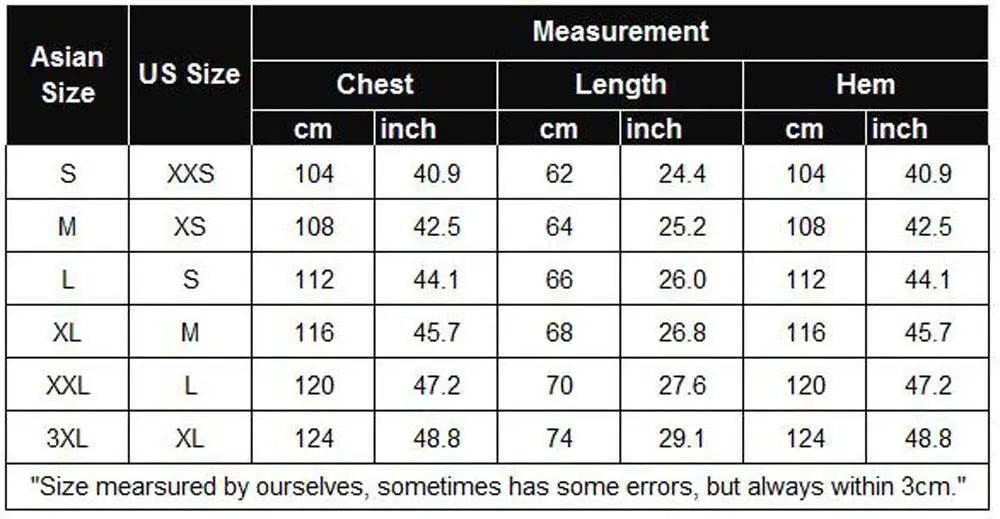 Asian Size US Size Chest Length Hem S