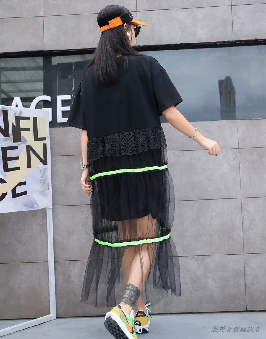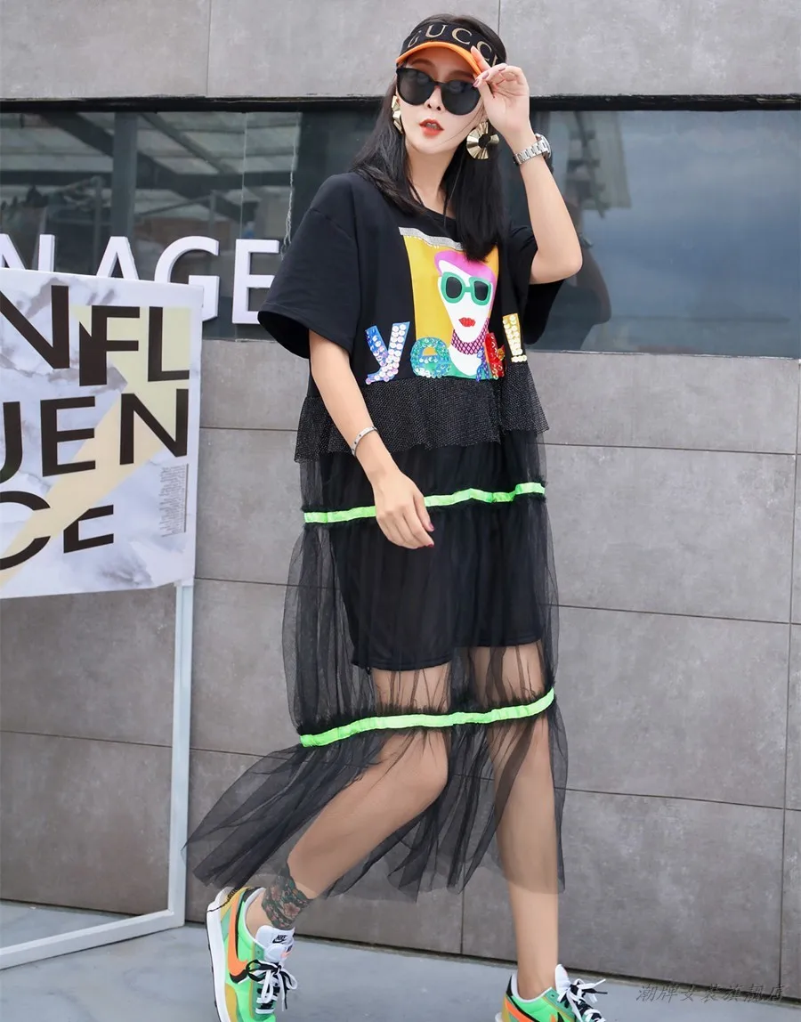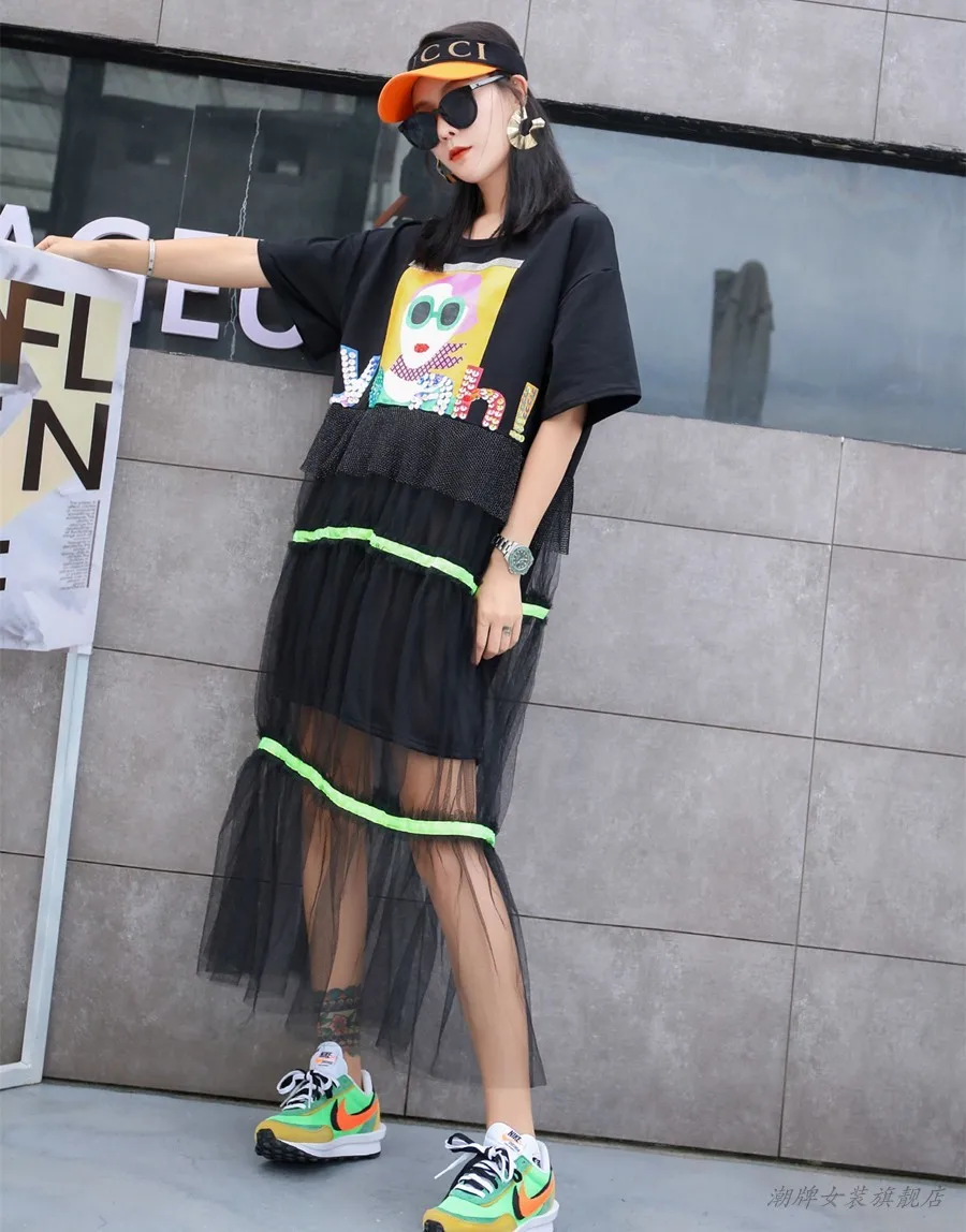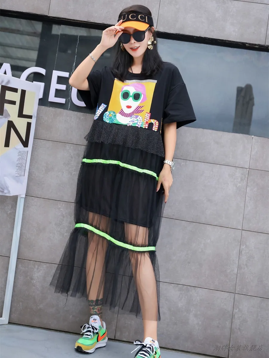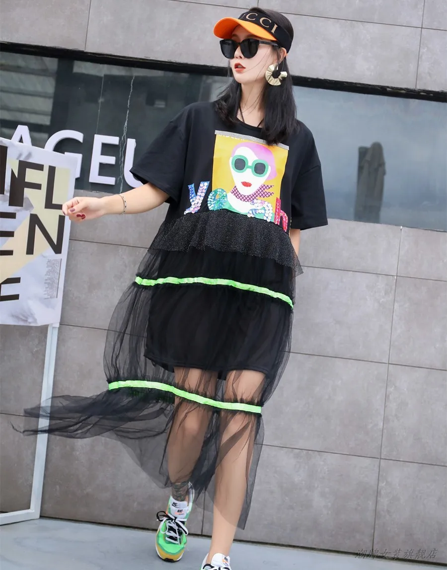 QING MO, женское летнее Сетчатое платье-футболка в стиле пэчворк, женское платье с рисунком для девочек