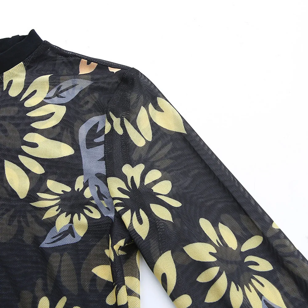 Женский короткий топ с цветочным принтом и длинными рукавами, прозрачная блузка!
