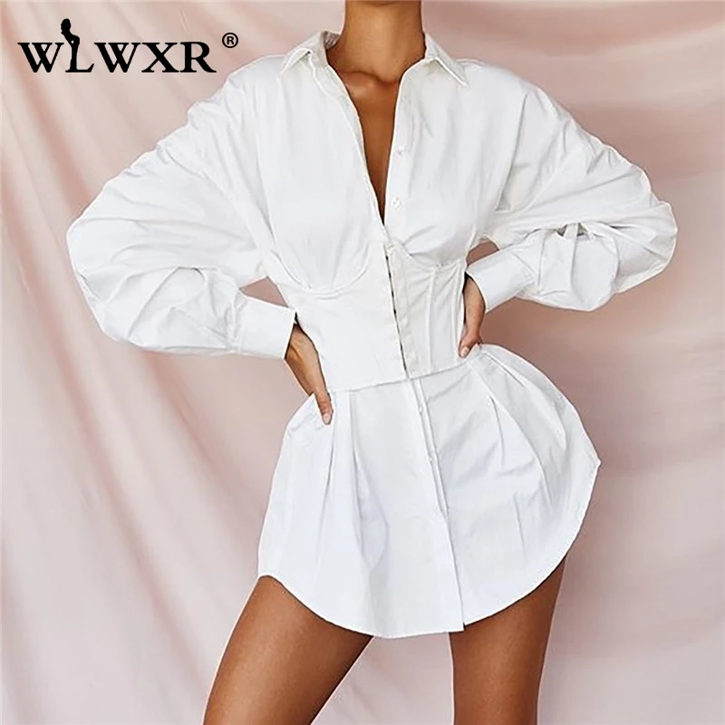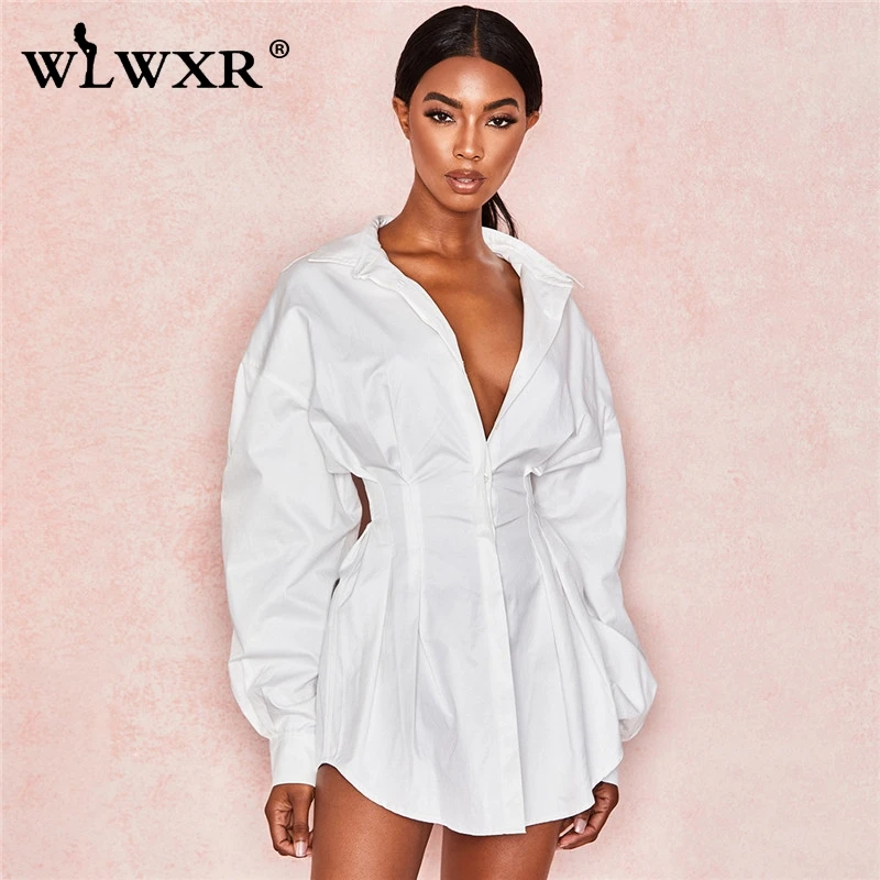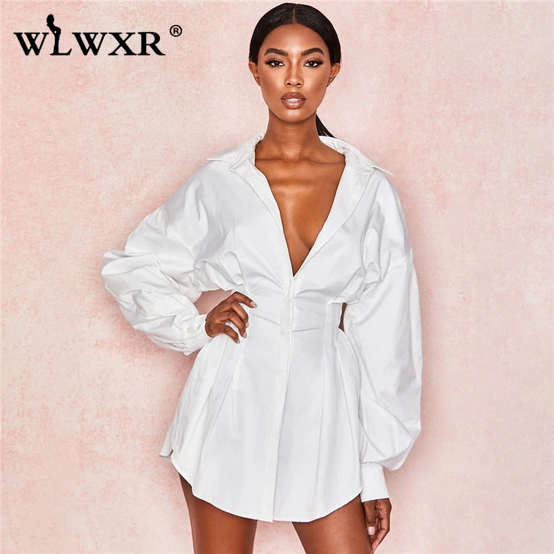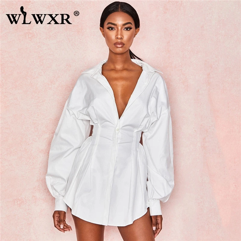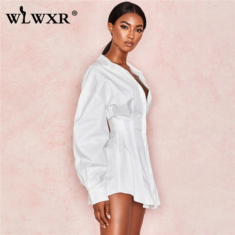 WLWXR повседневное белое Бандажное платье, летнее платье для женщин, 2019, сексуальное мини-платье с рукавами-фонариками для женщин, OL, свободное короткое вечернее платье