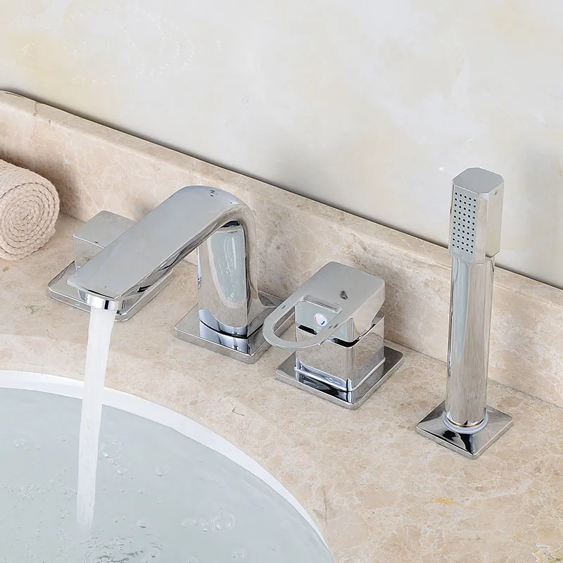 Особенность: Функция: Смесители для ванны Душевая лейка: ручная Материал: медь + пластик Установочные отверстия: 4 отверстия Количество ручек: 2 ручки Тип клапана: Керамический клапан Функция: холодная и горячая вода Посылка входит: 1 комплект x смеситель (включая шланг)
