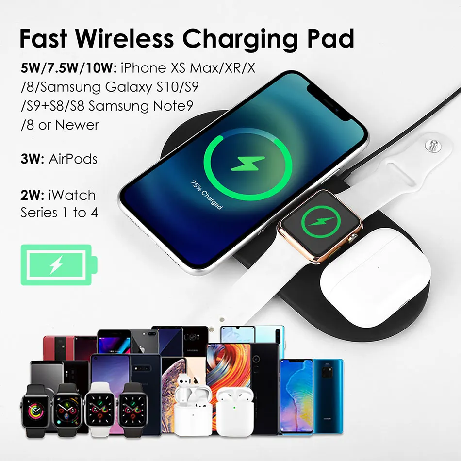 3 в 1 Быстрое беспроводное зарядное устройство может использоваться для зарядки телефона для iPhone XS Max/XS XR/X/8/8 и/Samsung Galaxy S10/S9/S9 S8/S8 или более новых Samsung Note9/8 и AirPods и Apple Watch серии от 1 до 5. Это Беспроводное зарядное устройство очень легко носить с собой. При зарядке он не будет гореть, и у него есть светодиодный дисплей. Рекомендуется использовать адаптер быстрой зарядки QC 3,0 (не входит в комплект).