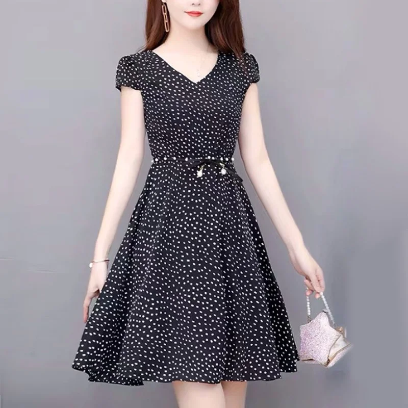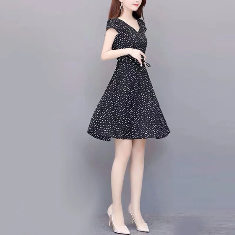 * Описание товара: повседневный, круглый вырез, короткий рукав, обхват талии, горошек, а-силуэт