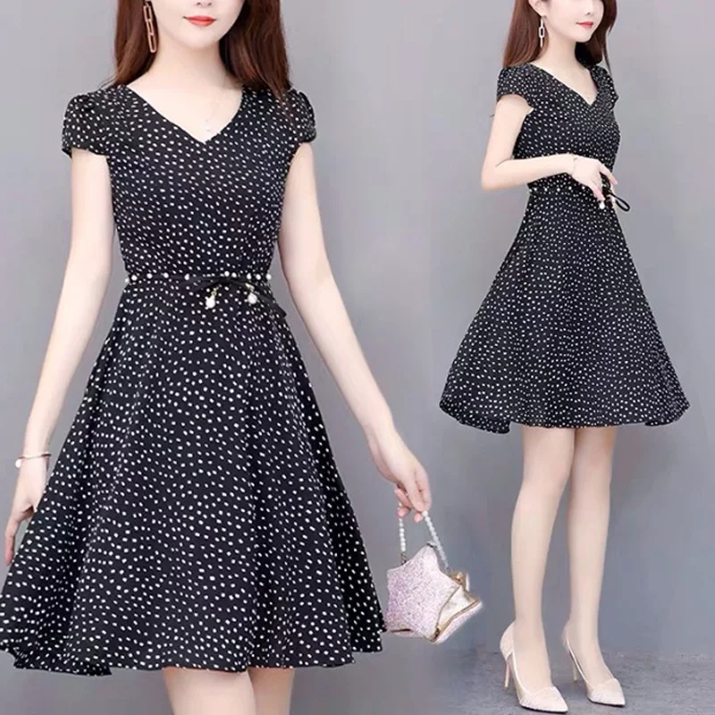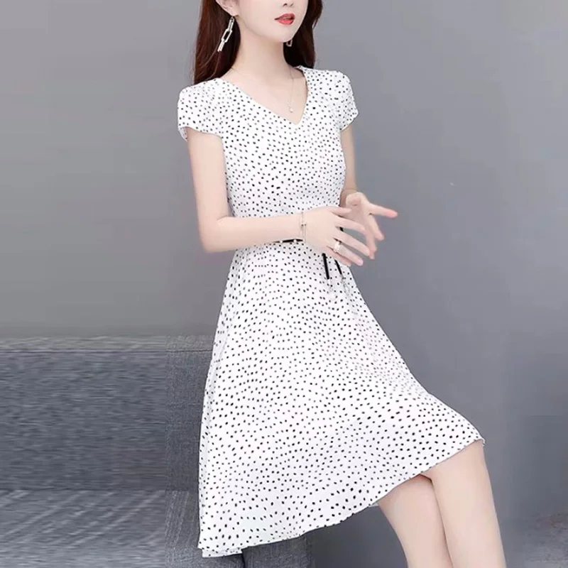 * Описание товара: повседневный, круглый вырез, короткий рукав, обхват талии, горошек, а-силуэт