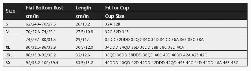 3XL: 92cm-100cm 33.5cm 40DDD 40QD 42D 42DD 42DDD 42QD 44B 44C 44D 44DD 46A 46B 46C