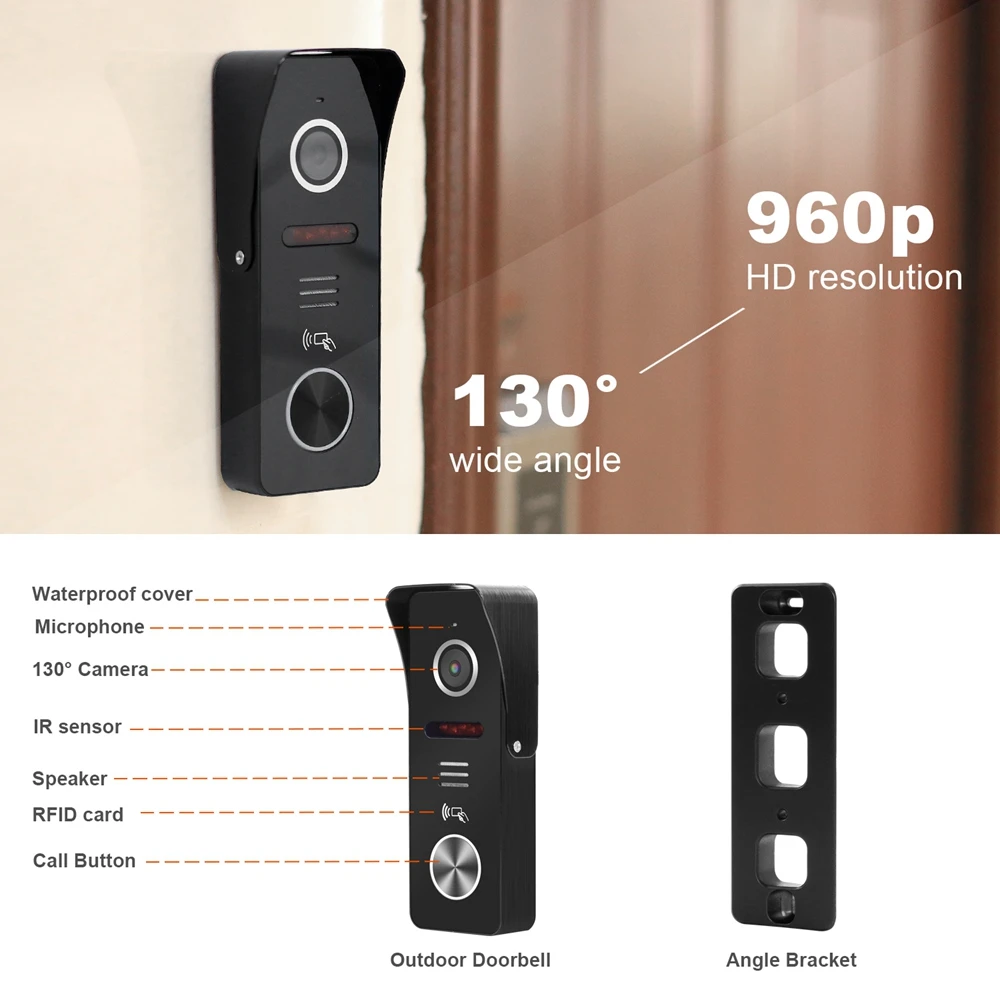 Датчик камеры: 1/3 КМОП, 960P Угол обзора камеры: 130 ° Ночное видение: Инфракрасная камера с режимом ночного видения Особенности: непромокаемые, пылезащитные и антивандальные Питание: питание от внутреннего монитора Материалы: алюминиевый сплав