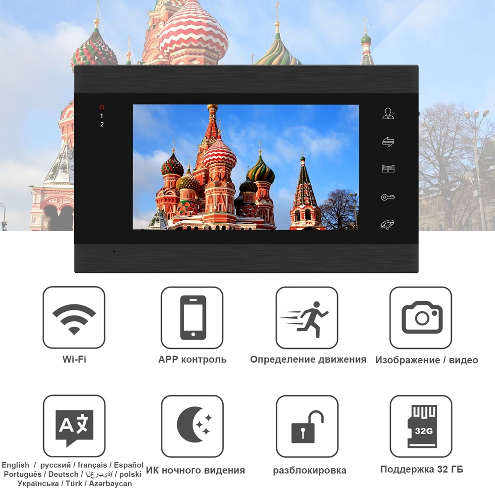 1. Контроль в реальном времени с помощью смартфона, разблокировка, запись видео/изображений, 2 способа разговора 2. Смартфон подключается к монитору, доступен для мониторинга дверных колокольчиков или камер 3. Необходимо установить приложение tuya smart в вашем телефоне 4. Монитор соединяет дверные звонки и камеры проводами 5. Эта система поддерживает 1200TVL/HD 720 P/HD 960P дверной звонок и видео вход камеры 6. После подключения успешно, вы можете в реальном времени подключить этот видеодомофон по wifi или сети 4G 7. Система контроля поддерживает английский/немецкий/русский/польский 8. Кнопки монитора поддержка языков английский/русский 9. Поддержка обнаружения движения, запись видео на карту памяти 10. Максимальная поддержка монитора 32 Гб Внешняя карта памяти 11. Монитор автоматически выключит экран после остановки работы в течение 1 минуты, чтобы сэкономить электроэнергию