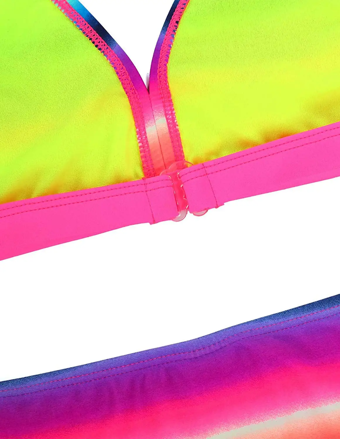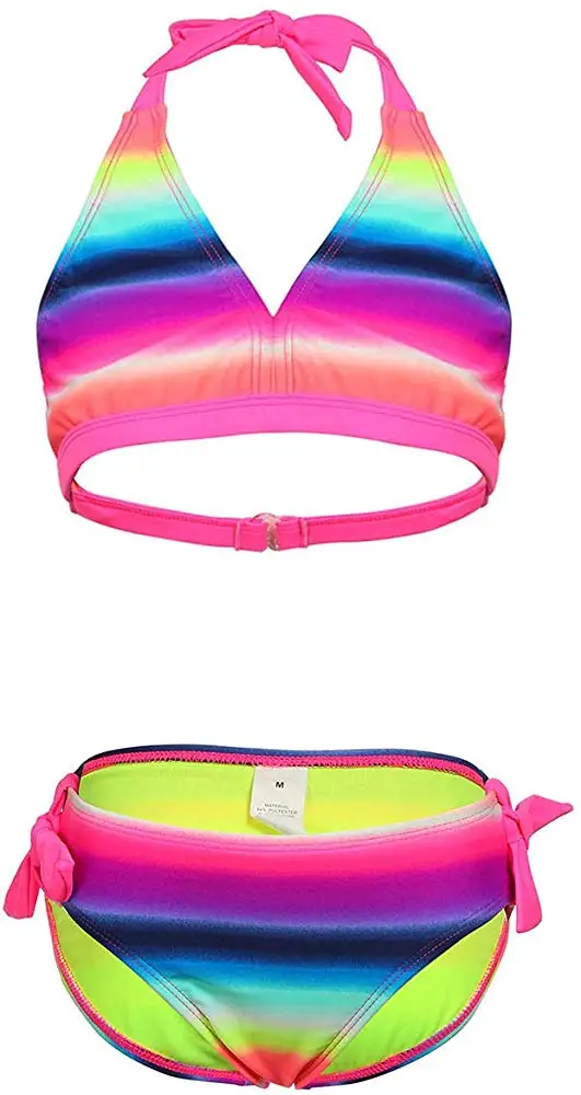 Гавайский стиль кокосовое дерево печатных Холтер ремень из двух частей бикини набор для девочек Мягкий материал: 84% полиэстер, 16 процентов эластан Воротник с v-образным вырезом Кокосовое дерево, ананас, Радужный принт Регулируемый ремешок завязывается сверху, застежка на крючок сзади Ремешок с обеих сторон Подкладка полностью