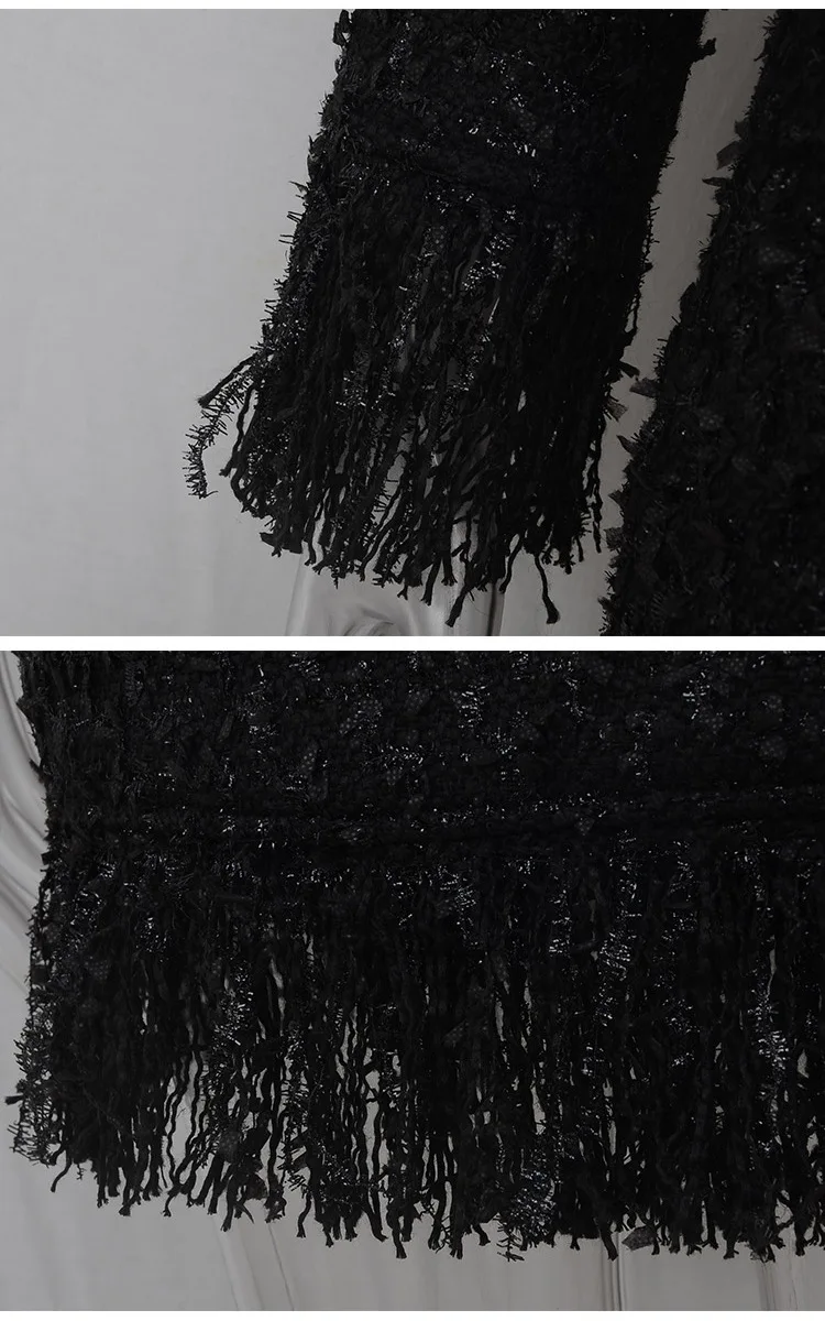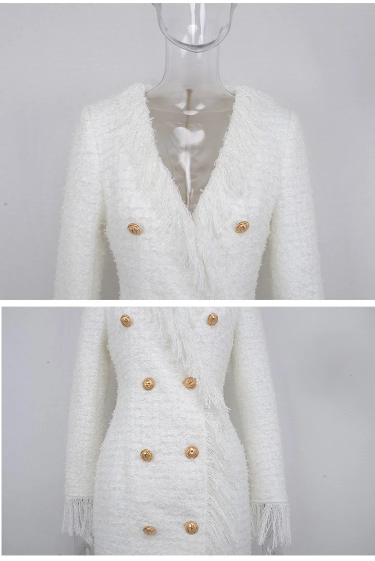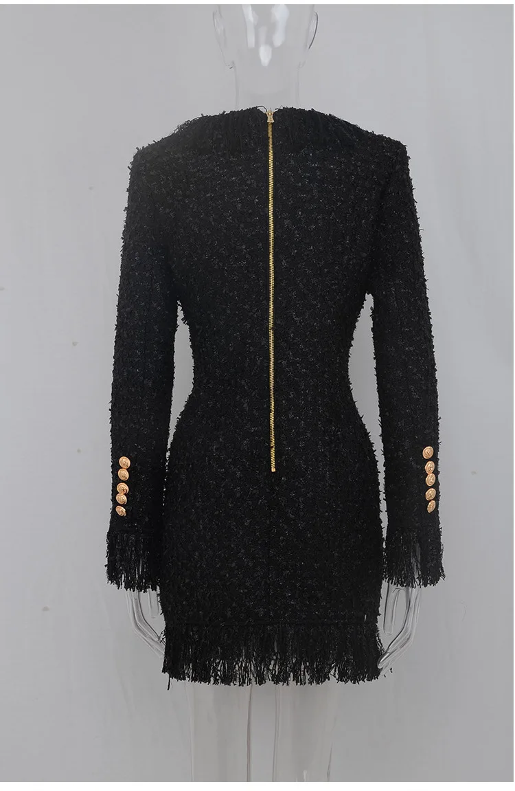 Женское твидовое платье с кисточками для подиума, платье с v-образным вырезом и золотыми пуговицами, платье с длинными рукавами из смесовой шерсти, женские сексуальные вечерние платья на зиму