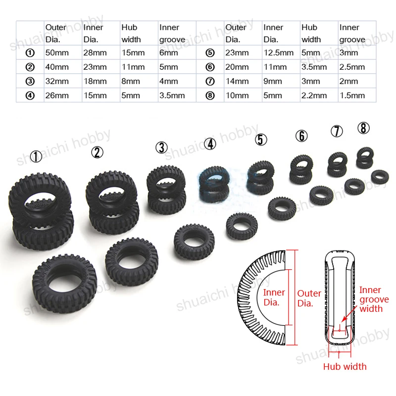 Спецификация:Название продукта: шины для моделирования/мини-шины/микро-колесаВнешний диаметр: 10 мм/20 мм/23 мм/26 мм/32 мм/40 мм/50 ммЦвет: черный