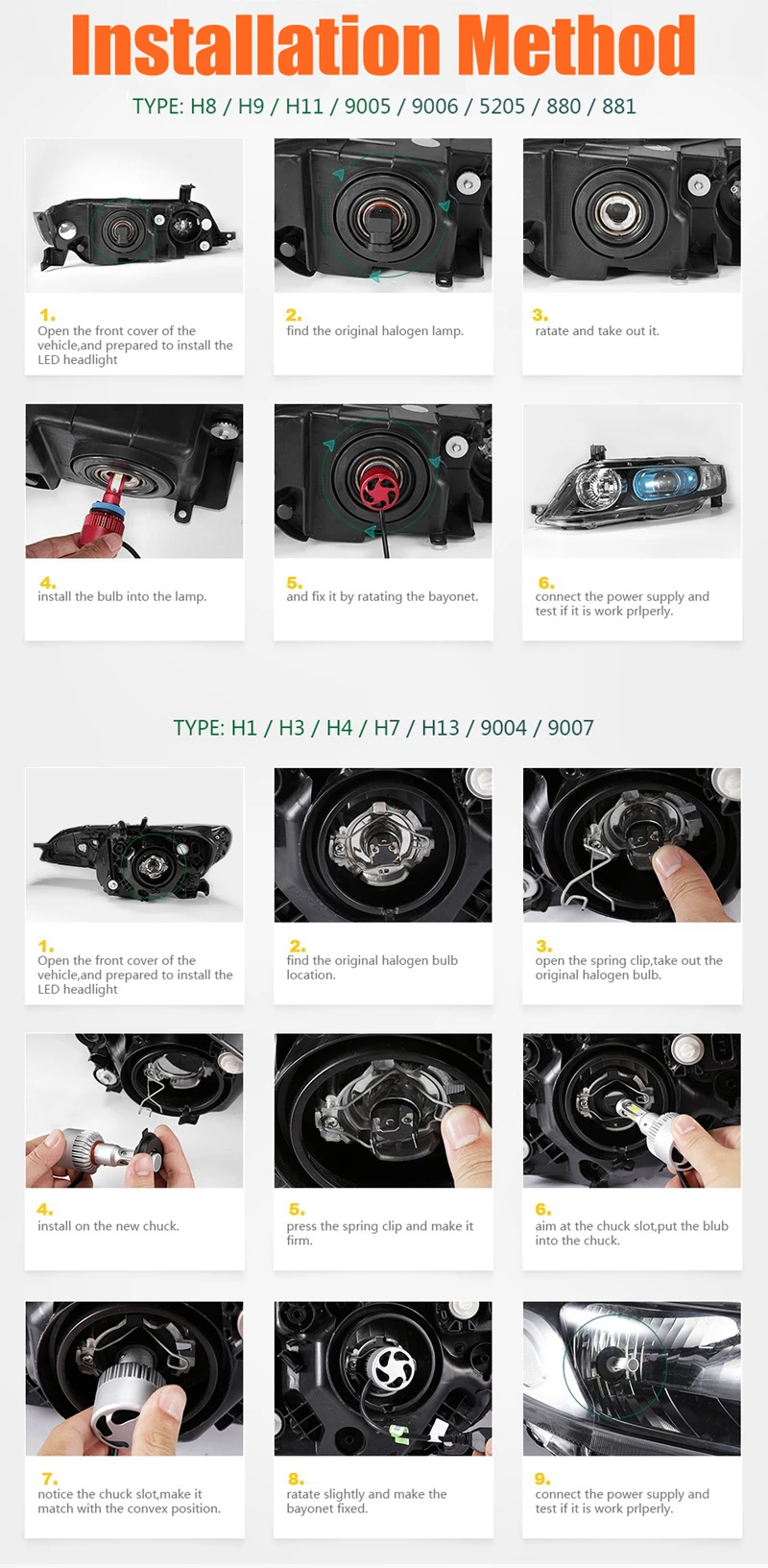 1. Пожалуйста, проверьте светодиодный светильник базового типа и размера вашего автомобиля, чтобы подтвердить, подойдет ли товар. 2. В качестве предосторожности убедитесь, что автомобиль имеет время, чтобы остыть должным образом, прежде чем начать процесс установки 3. Убедитесь, что зажигание выключено и ключи удалены 4. Полностью проверьте соединение контактных точек, портов и проводов, так как неисправные соединения могут вызвать проблемы с освещением