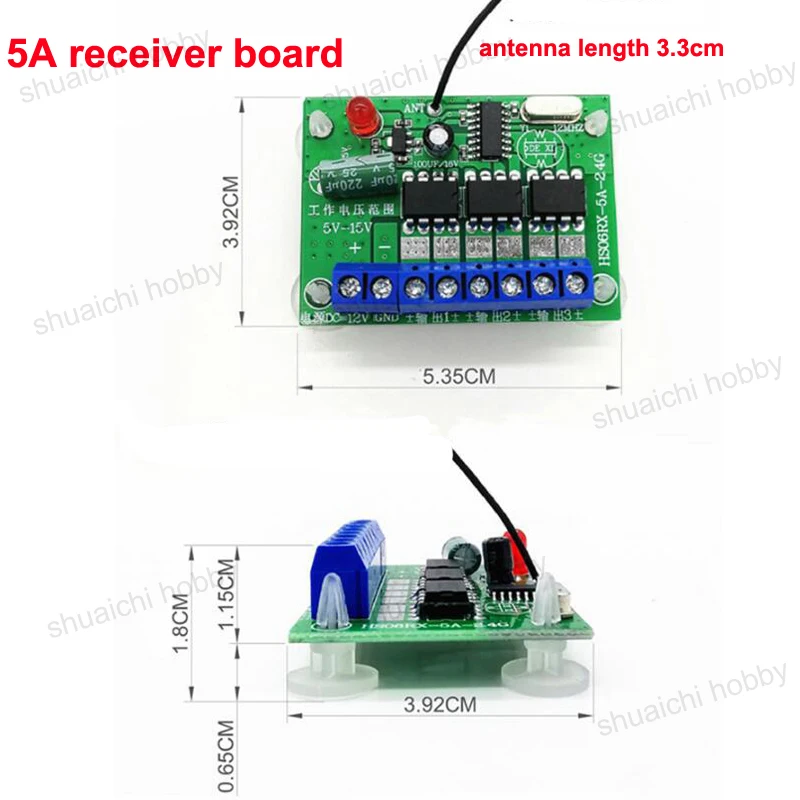 6CH 2,4G дистанционное управление Управление, р-р 6-15V/3,6-6V 50 м расстояние большой/маленький Мощность hdmi передатчик и приемник для Радиоуправляемый игрушечный автомобиль/лодка модели DIY аксессуарыСпецифика:-Рабочее напряжение пульта дистанционного управления: 3 В постоянного тока-1.2A приемника (красный, зеленый, синий) Рабочее напряжение на входе: DC 3,6 V-6V-5A приемника (красный, зеленый, синий) Рабочее напряжение на входе: с источником питания от постоянного тока, 6V-15V-1.2A размер платы приемника: 55*33 мм-Размер платы приемника 5A: 55*36,5 ммОсобенности:Этот комплект очень хороший, он может управлять 3 шт высокой мощности двигателя, он хорош для танка, корабля, автомобиля. У нас есть видео.Примечание:-Так как плата приемника является специальным продуктом, нестабильная работа персональных DIY, приемная плата не принимает возврат и послепродажное обслуживание-Когда Корабль управляется удаленно, расстояние дистанционного управления будет зависеть от уровня воды и разницы в высоте поверхности воды.Посылка будет зависеть от вашего выбора