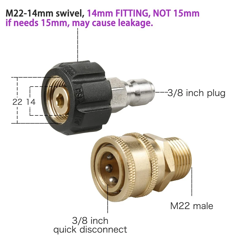 Внимание M22 14 поворотный фитинг имеет внутренний диаметр 14 мм, если шайба 15 мм, это может привести к утечке. Не совместим с Sun Joe, Campbell, MI-T-M, AR Blue, Stanley, Cleanforce , Simoniz, которые имеют фитинг M22 15 мм