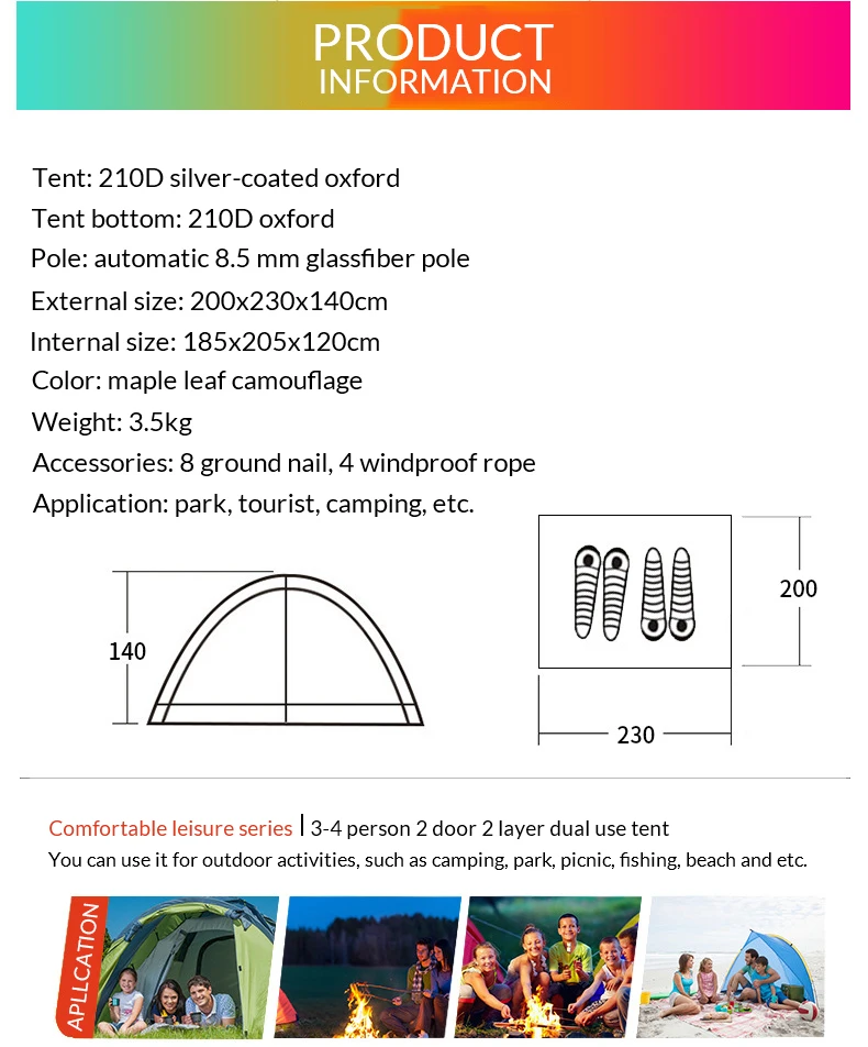Модель: SY-A14-1 Внутренний Размер: 185*205*120 см Внешний размер: 200x230x140 см Размер упаковки: 78*17*17 см Вес брутто: около 3,5 кг Внешний материал: 210D ткань Оксфорд покрыта серебряным клеем Внутренний материал: 210D Оксфорд + B3 сетка 210D Оксфорд PU3000 Полюс: 8,5 мм Стеклопластик автоматический бар Цвет: кленовый лист камуфляж Аксессуары: 8 колышек, 4 ветрозащитный трос, 1 ручная сумка