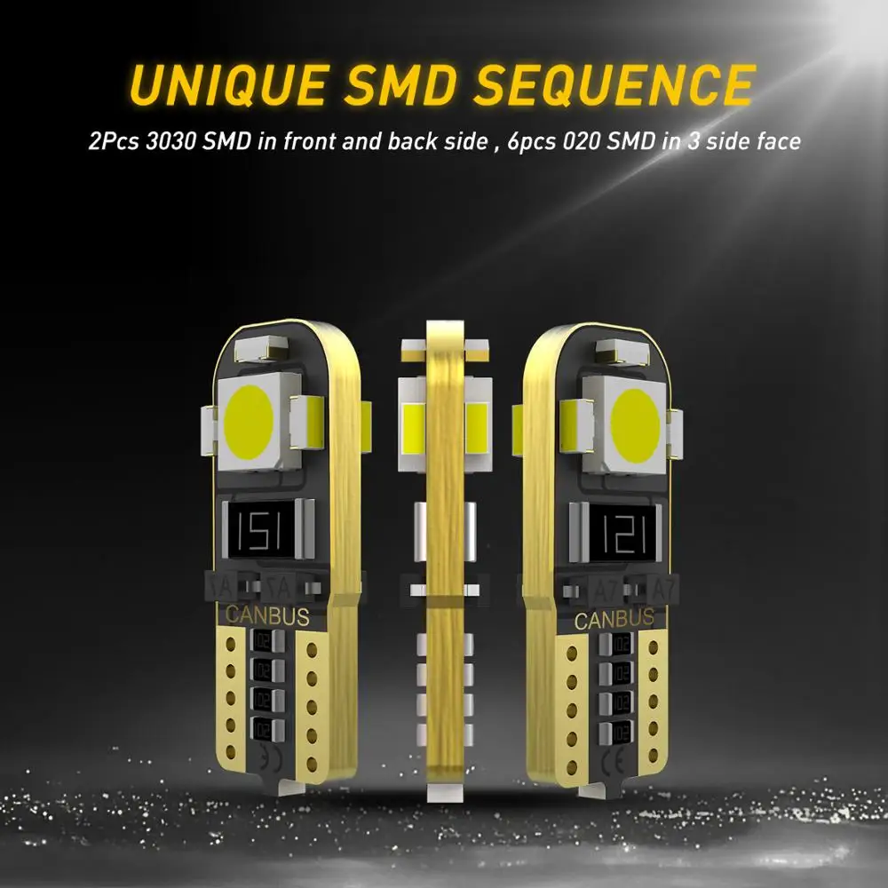 Тип разъема: T10/194/W5W/194/168/2825 Чипы: 2 шт. 3030 SMD + 6 шт. 020 SMD Напряжение: 12-14 В постоянного тока Мощность: 1,8 W Размеры: 1,1 дюймов * 0,37 дюймов