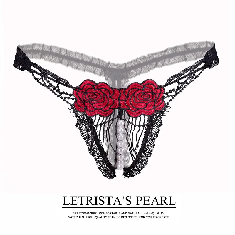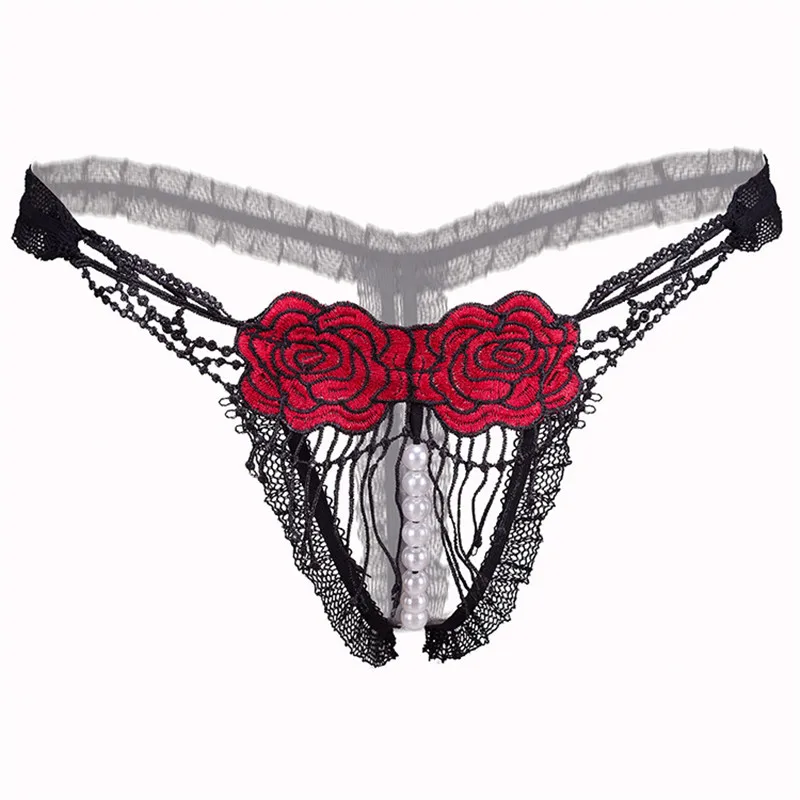 Lady Sexy Bikini underwear Lace Rose Printing Pearl Chain Massage Flirt Sexy Thong Panties For women Body Jewelry Valentine gift