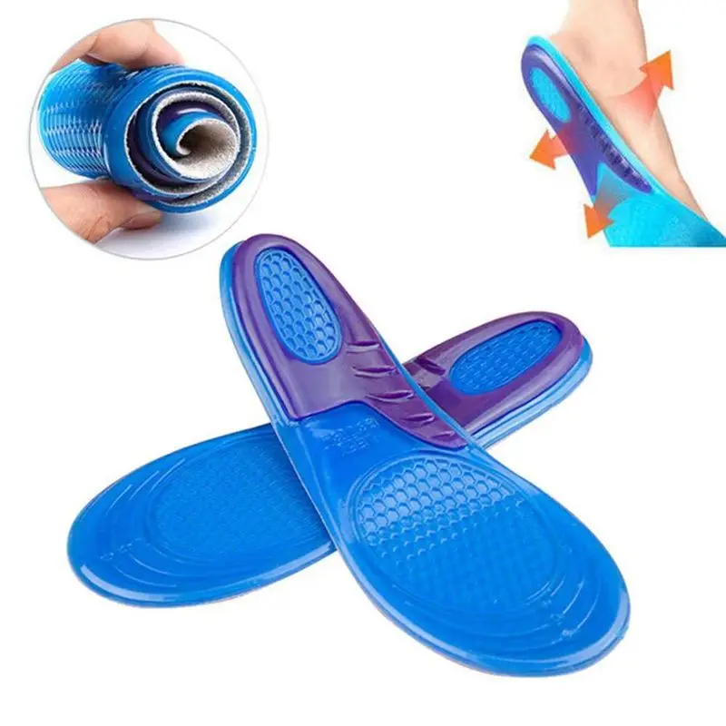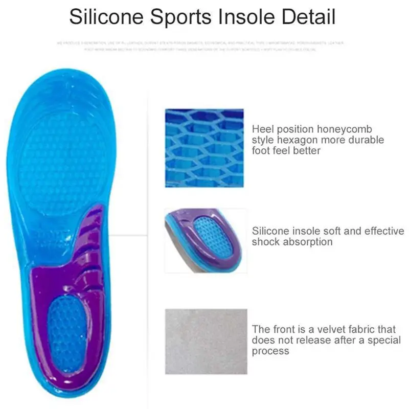 Sports gel insoles adopting unique honeycomb design inserts in the heel and forefoot, which effectively absorbs the impact of each step to reduce stress and fatigue. Ergonomically designed to contour to the foot with a neutral arch to provide support for any type of foot arch