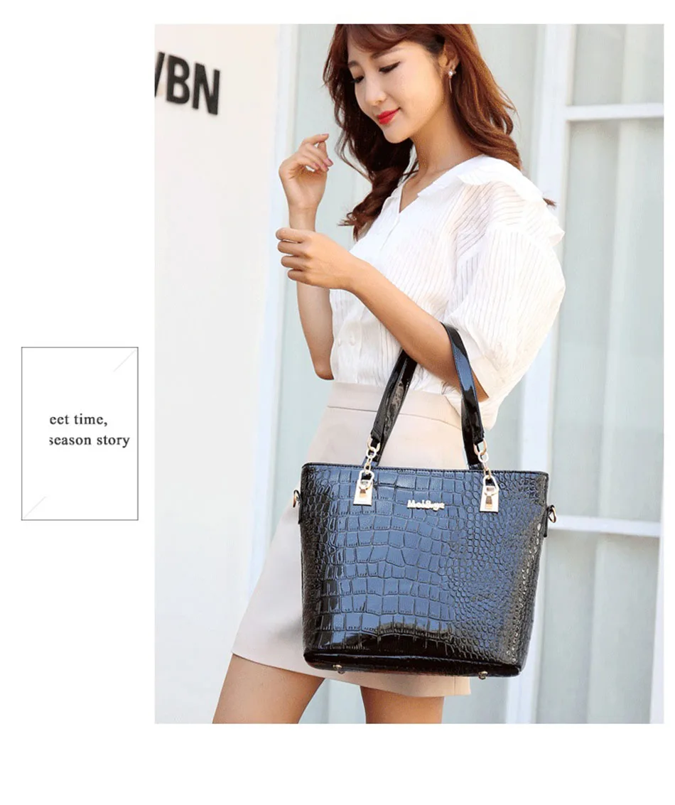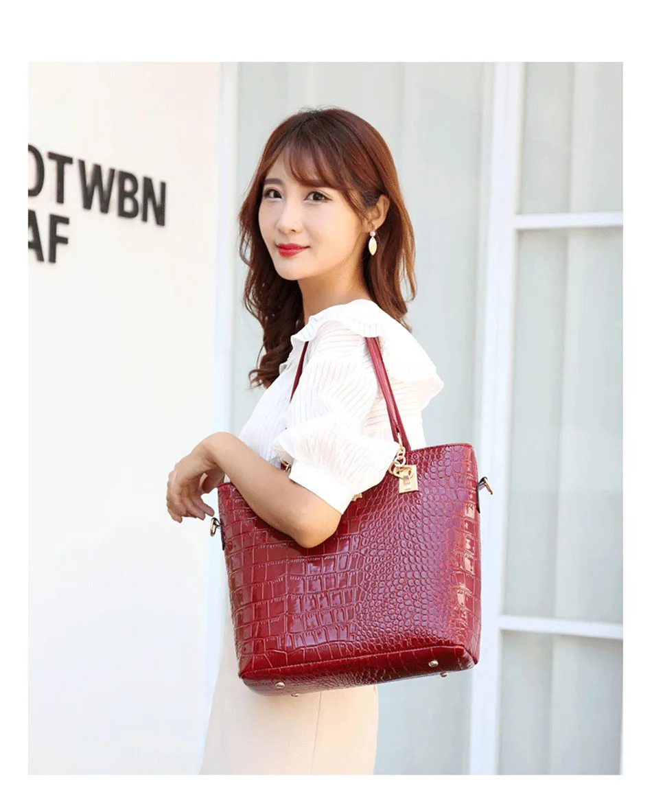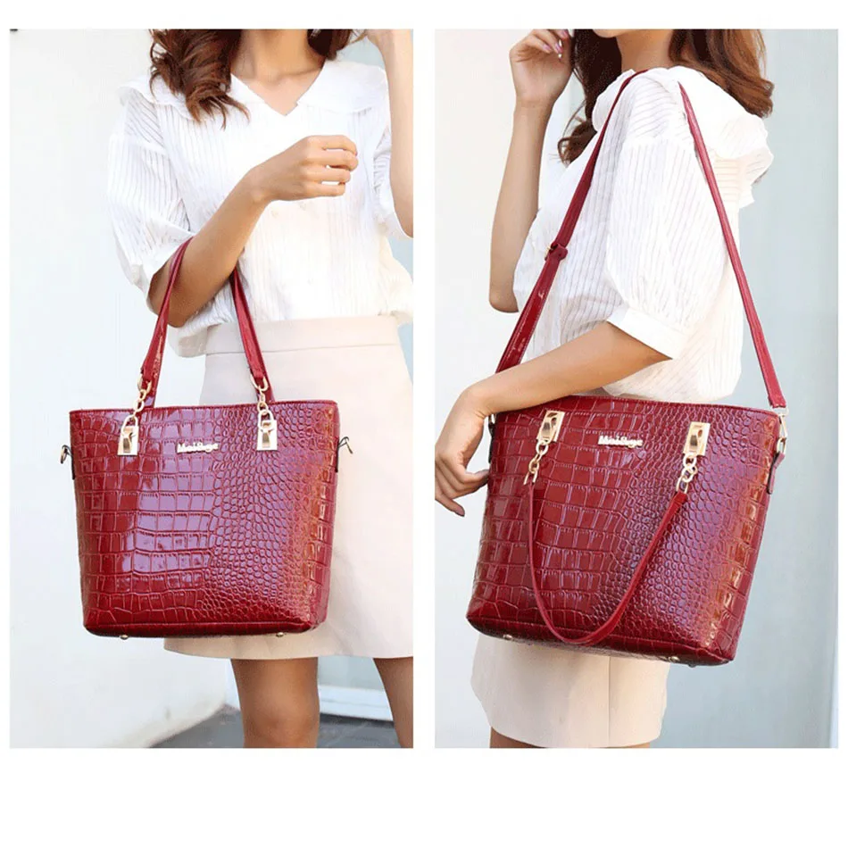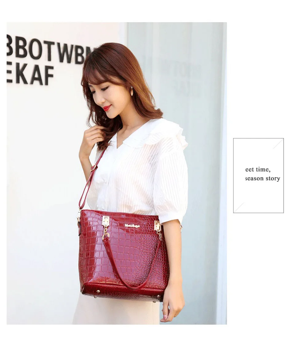 Цвет: черный, красный, винно-красный Материал: из искусственной кожи, лакированная кожа Пол: женщины, женщины, дамы, девушки, Стиль: Модный, роскошный, классический Рисунок: однотонный Подкладка: полиэстер Застежка: молния Сезон: весна, лето, осень, зима Повод: шоппинг, работа, офис, ежедневно, Размер сумки: Сумка: 29x13x28см Маленькая сумочка: 27x14x19cm Сумка через плечо: 28x9x20см Кошелек: 19x10 см Клатч: 15x8 см Сумка для ключей: 5x10 см