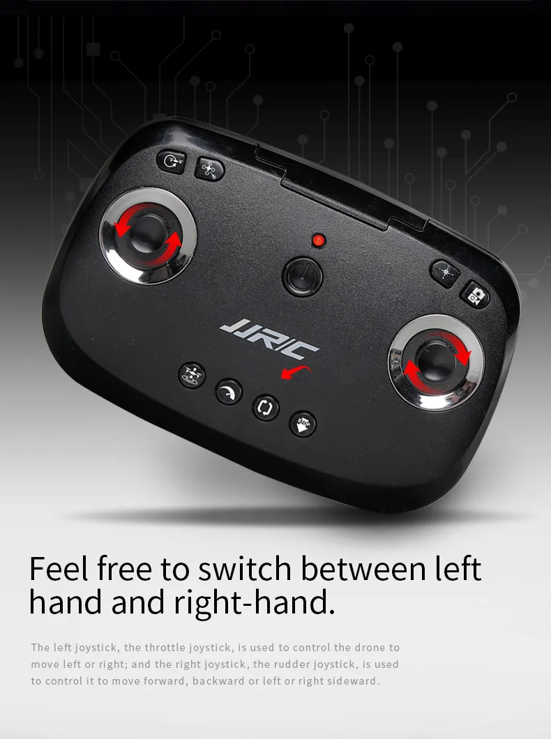 Левый джойстик, джойстик дроссельной заслонки, используется для управления дроном, чтобы двигаться влево или вправо; А Правый джойстик, джойстик руля, используется для управления им, чтобы двигаться вперед, назад, влево или вправо в сторону.