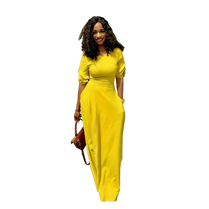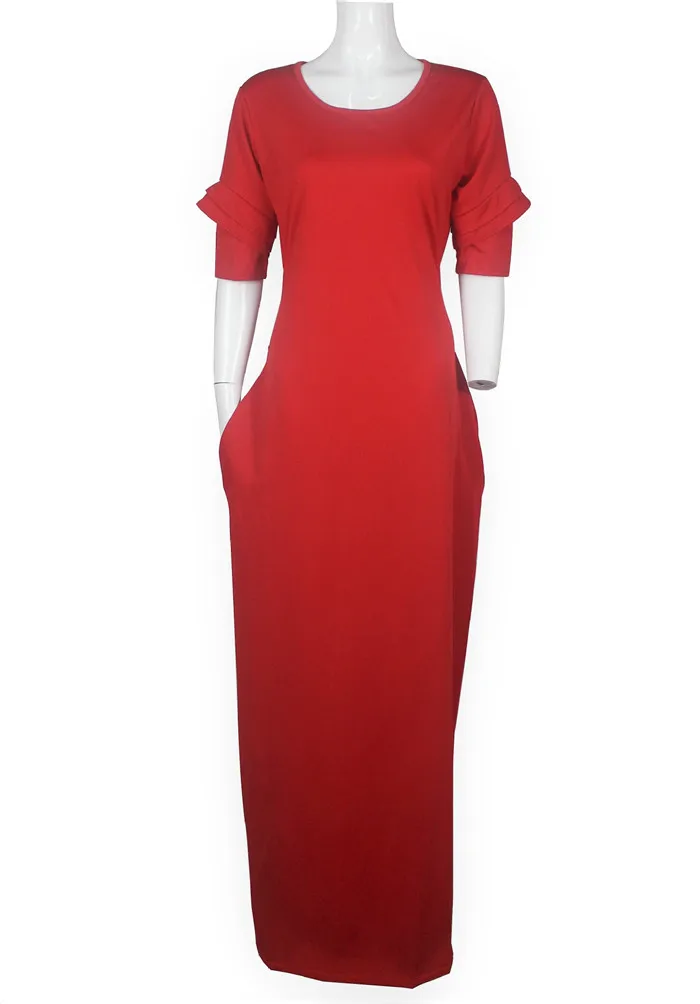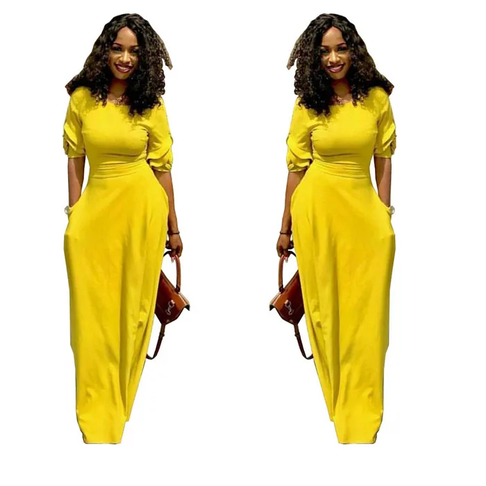 Модное повседневное длинное платье с круглым вырезом и коротким рукавом и карманом в африканском стиле, женское платье макси, однотонное красное, желтое, черное