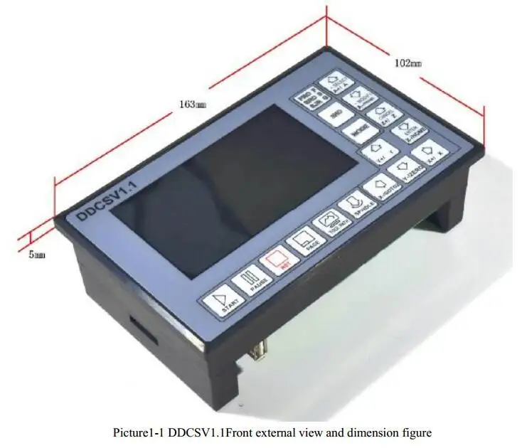 На передней части изделия составляет 17 ключа пользователя и 1 4,3 \ 'и 480*272 ЛСД (жидкокристаллический Дисплей), и изнаночная сторона входного сигнала, шпиндель, контроль, шаговый/серводвигатель, MPG и другие четыре набора интерфейсов, а также интерфейс USB и интерфейс питания. Пожалуйста, посмотрите на картинку 1-3 и картинку 1-4 в деталях.