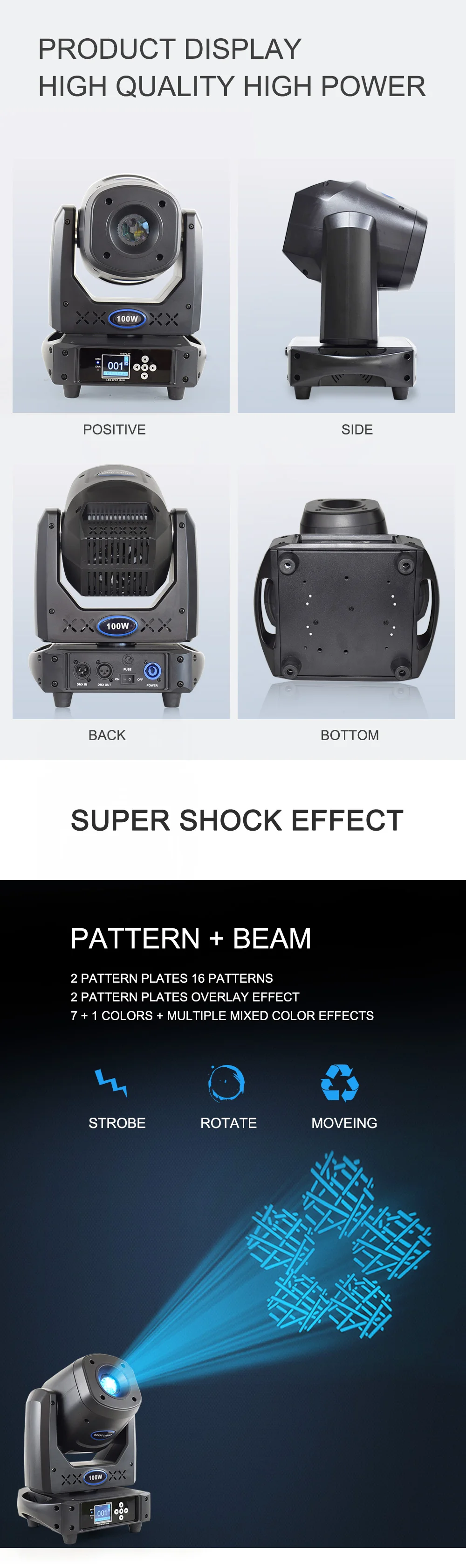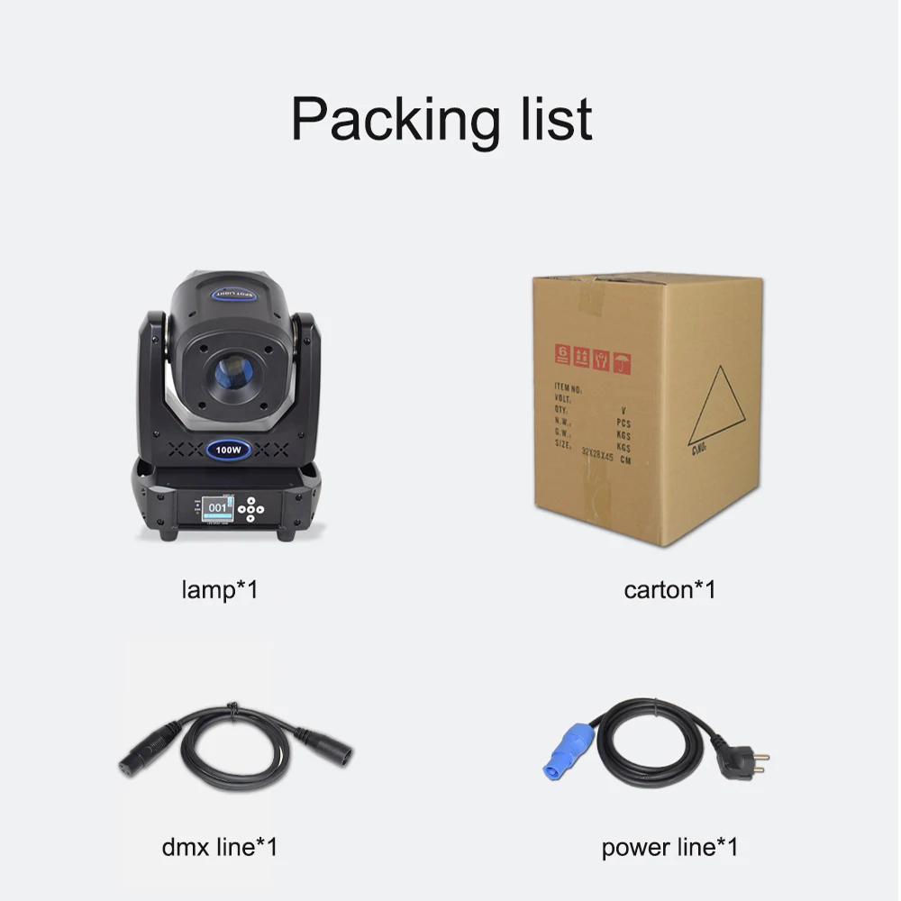 Технические параметры: • Высокая мощность 100 Вт Светодиодный прожектор с моторизованным зумом • Моторизованный фокус • Моторизированный зум: угол луча 12-18 градусов • 3 режима работы: звук активный, режим показа и DMX контроль • 4 встроенных освещения • Электронное Затемнение: 0% - 100% • Электронный Стробоскоп/импульсный эффект; Случайный стробоскоп медленного до быстрого • 5 кривых затемнения • Обратный режим панорамирования/наклона для контрастного движения, когда приспособления соединены между собой • Быстрое движение наклона панорамирования • Эффект дрожания Gobo • 5 фасетных вращающихся призмовых эффектов • 16-уровневая Fine Pan/Tilt контрольный • Шаговые двигатели с микрошаговым механизмом • 3-контактный XLR Сделано в Китае внутрь или наружу • Пресс-форма-4-кнопка DMX ЖК-дисплей меню с 180 ° обратный режим просмотра • Включает Омега кронштейн для крепления фермы • Охлаждение вентилятора Характеристики: • Источник: светодиодный светильник с высокой выходной мощностью 100 Вт • Люмен: 81810 Люкс @ 1 м 20000 Люкс @ 2 м 8484 Люкс @ 3 м • Переменный угол луча: 12 ~ 18 градусов угол луча • 15 режимов канала DMX • 8 цветов + пятна • 2 независимых колеса Gobo: колесо Gobo 1 имеет 7 статических Gobo's + Spot; Колесо Gobo 2 имеет 6 вращающихся Gobo's + Spot • Панорама: 540 градусов; Наклон: 200 градусов • Мощность Con питания от сети переменного тока/уменьшение зума на задней части для последовательного соединения Мощность (110V- 240V) • Strobe скорость передачи данных: 0,3-20 Гц • Длительный срок службы светодиодный (номинальная составляет примерно 50000 часов) • Многофункциональное напряжение: 100-230 В, 50 Гц/60 Гц • Потребляемая мощность: 150 Вт