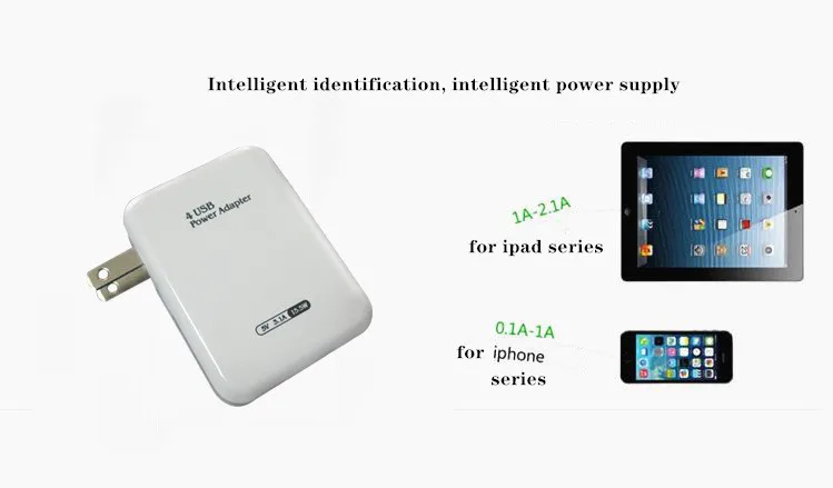 4USB зарядное устройство, 4USB зарядное устройство для путешествий многоинтерфейсное usb-зарядное устройство для Apple зарядное устройство samsung зарядник Универсальное зарядное устройство планшет зарядное устройство многофункциональное зарядное устройство USB зарядное устройство usb-адаптер 1. Малый размер (всего 68*50*27 мм) и те же продукты питания на рынке, наш объем меньше, внешний вид приличный и производительность стабильная; 2, 4 USB интерфейса, может заряжать 4 устройства одновременно; 5, Пульсация постоянного тока небольшая, эффективность работы высокая. 6. Широкий диапазон входного напряжения (100-240 в) в соответствии с мировыми стандартами использования. 7, низкая рабочая температура, длительный срок службы. 8. Хорошая производительность изоляции и высокая электрическая прочность. 9, в соответствии со стандартами RoHS 10, сильная совместимость, может заряжать samsung планшет и мобильный телефон, все версии Apple iPad, все версии iphone и ipod, но также может заряжать другие бренды компьютеров с плоской панелью, мобильных телефонов, цифровые камеры, psp и другие электронные продукты. Параметры продукта: * Входное напряжение: 100-240 В переменного тока * Диапазон входных частот: 47 Гц ~ 63 Гц * Входной ток: 100 мА (макс) при AC100V * Эффективность: ≥65, 5% (мин) при номинальном напряжении * Выходное напряжение: 5 В (4,75 В ~ 5,25 в) ± 5% * Номинальный ток выхода: 3.1A * Выходная пульсация и шум: ≤40мв пик-пик * Задержка загрузки время: ≤ 3 S (тестовое Состояние: 110 V входного напряжения переменного тока)