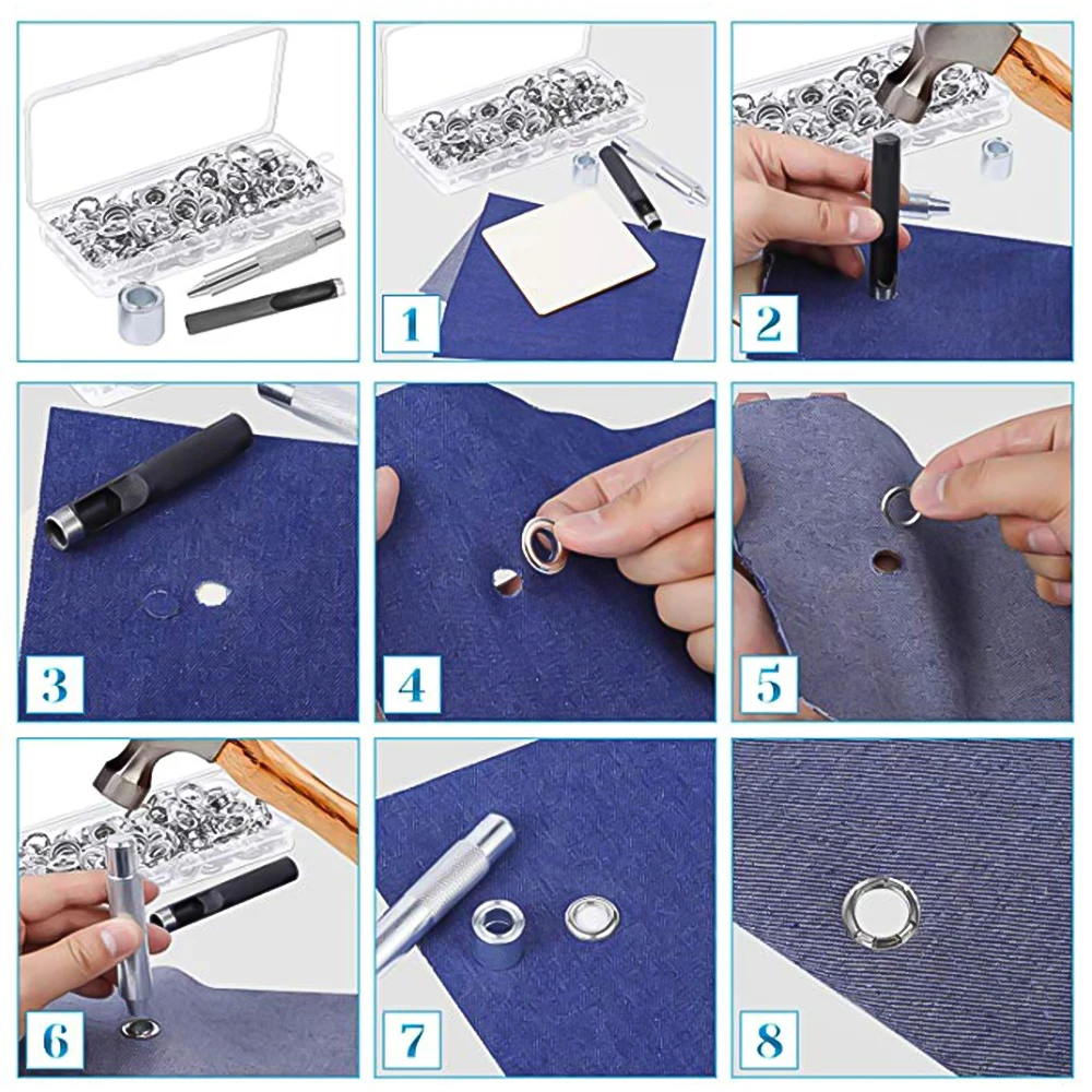 Посылка включает в себя:120 комплектов люверсов, 1 Перфоратор, 1 основание, 1 установочный инструмент