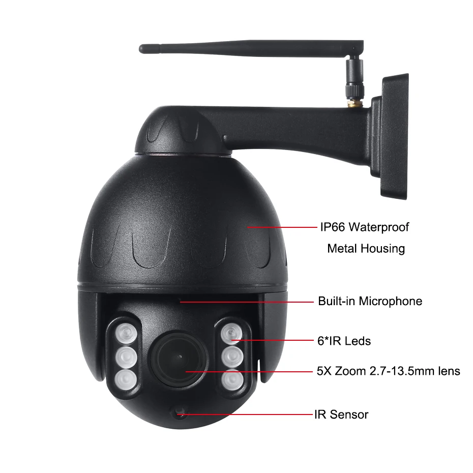 2. Встроенная Wi-Fi антенна, это беспроводная камера 3. Встроенный разъем кабеля RJ45 ethernet, вы также можете подключить кабель RJ45 ethernet для использования в качестве проводной ip-камеры 4. Встроенный 2,7-13,5 мм 5x оптический зум Автофокус Объектив, обеспечивает супер широкий угол обзора 96 ° ~ 26,2 ° 5. Камера может панорамировать наклон вращается через телефон/ПК, горизонт: 0 ~ 355 °, вертикальный: 0 ~ 120 ° 6. ПоддержкаАвтоматический круиз, Камера может перемещаться автоматически, так как ваши настройки от postion A к postion B, затем к C и D .... и т. Д. Поддерживает 8 предустановленных точек, поддерживает интеллектуальную функцию памяти, автоматически возвращается в точку No. 1 после отключения питания 7. Встроенный микрофон и громкоговоритель, поддержка аудио мониторинга и двухсторонний аудио домофон разговор между камерой и телефоном 8. Встроенный 6 шт. инфракрасных ИК-светодиодов с автоматическим IR-CUT, дальность ночного видения 50 метров, поддержка дневного и ночного видения 24/7 записи 9. Камера оснащена слотом для карты памяти, поддержка tf-карты/micro SD карты до 128G 10. Поддержка записи движения и оповещения по электронной почте. 11. Поддержка отправки изображений тревоги на адрес электронной почты, 12. Поддержка загрузки будильника фотографий и видео на ftp-сервер13. Поддержка записи будильника фотографии и видео на карту Micro SD14. Поддержка сигнализации мобильный телефон сообщение push 15. Поддержка удаленного просмотра с телефона app /PC клиента в любое время и в любом месте 16. Поддержка удаленного воспроизведения/загрузка записей карт памяти из приложения для телефона/IE broswer/удаленного ПК клиента 17. Предоставляем бесплатное приложение для android и ios CamHi и многоканальное CMS ПК клиентское программное обеспечение. 18. Название приложения для телефона: CamHi 19. Поддержка подключения Plug n Play P2P 20. Поддержка max Onvif 2,4, камера может работать с Onvif NVR recorder 21. Поддержка жесткого сброса от кабеля камеры 22. Поддержка ручной записи, синхронизации записи, записи сигнализации 23. Поддержка точки доступа точка доступа Wi-Fi (режим AP), вы можете подключить камеру к телефону с помощью AP подключения даже без интернета. 24. IP66 наружный внешний водонепроницаемый для уличного использования 25 лет. Цвет камеры может быть выбран в черном или белом цвете. (Цвет по умолчанию черный на этой странице)