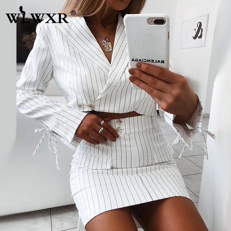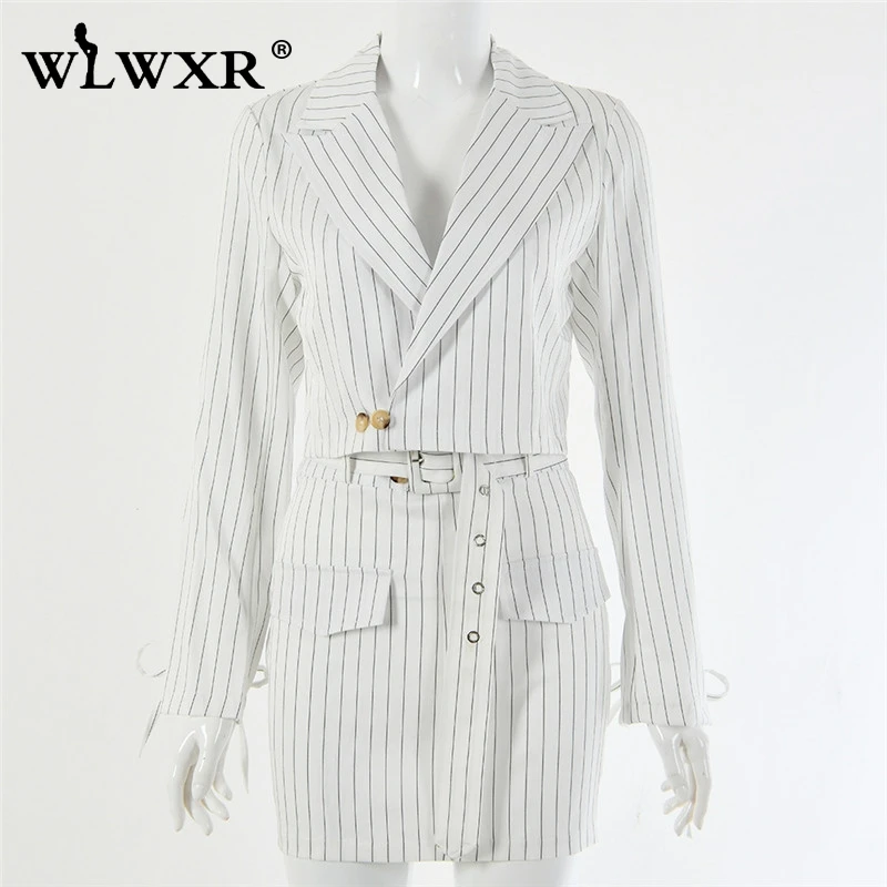 Женский офисный костюм WLWXR, белый облегающий костюм в полоску с женский комплект 2 шт. и длинным рукавом, облегающий Повседневный облегающий костюм с поясом, 2019