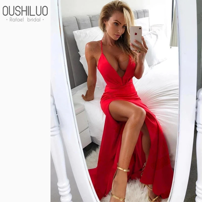 Сексуальная фуксия Стретч атласный Русалка вечернее платье с большим разрезом V шеи Sapghetti ремень развертки Поезд дешевый бандаж труба праздничная одежда на заказ