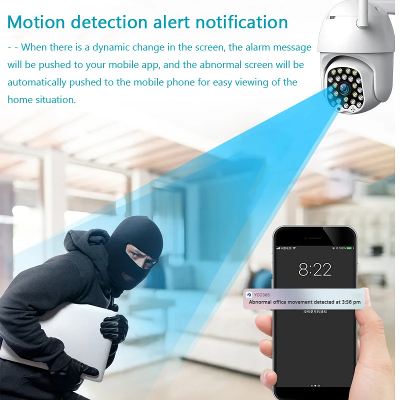 Функция обнаружения и сигнализации:Если неизвестный человек проникает в ваш дом или товары, которые были перемещены и украдены, когда ваш ребенок плачет, ваша ip-камера безопасности Wi-Fi немедленно начнет запись и отправит сигнал тревоги на ваш мобильный телефон. Вы можете дистанционно контролировать направление беспроводной внутренней камеры на вашем телефоне. Вы увидите, что происходит дома на 360 градусов.