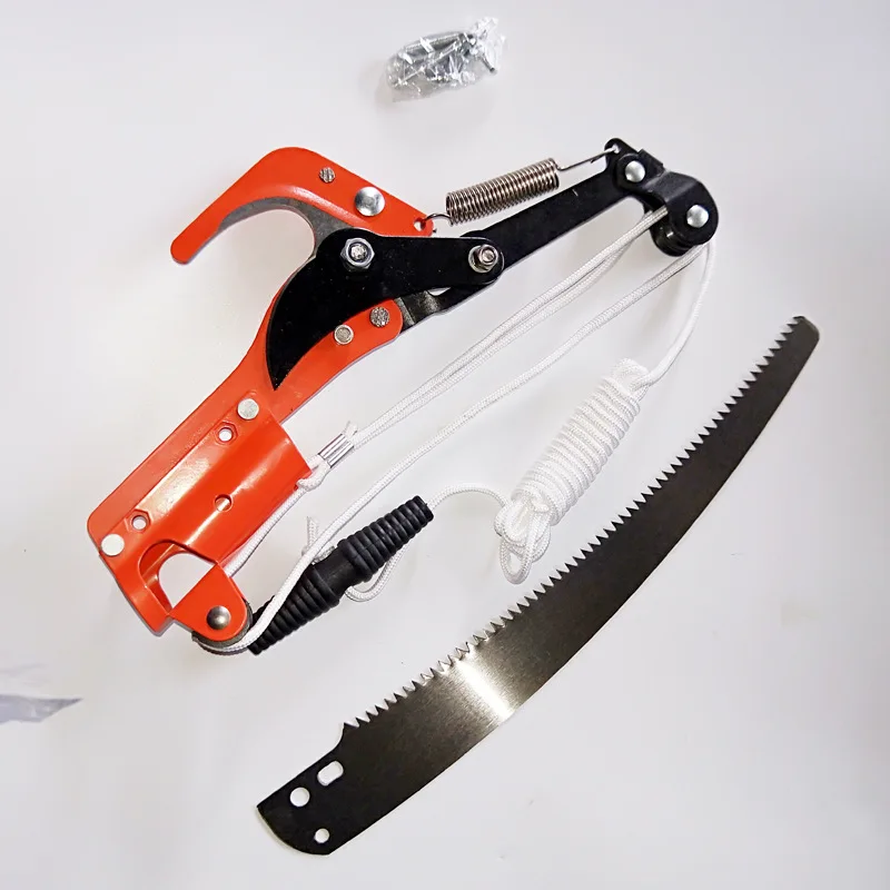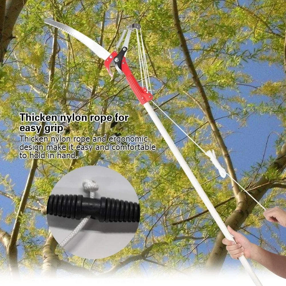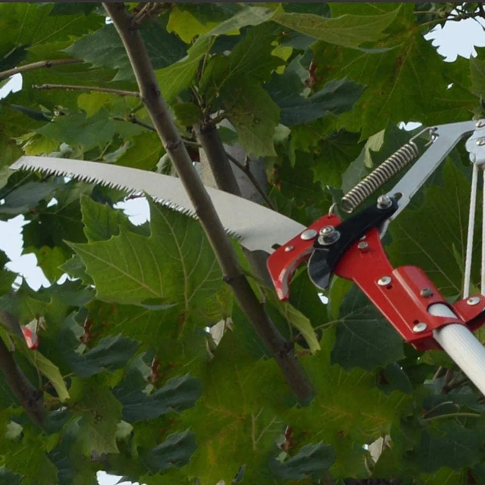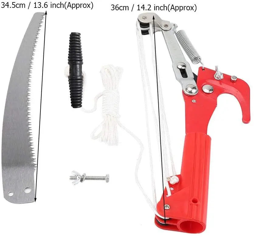 1. This convenient extensible tree pruner is ideal for cutting tall branches without climbing a ladder. 2. Fully hardened and precision-ground steel pruning blade stays sharp even through heavy use. 3. Made from high-carbon 65# steel and sharp on 3 sides, to make it knock thicker branches quickly and easily. 4. Easy to install and remove, no tools required. 5. Double pulley system to cut dense branches with minimum effort, save at least 25% effort. 6. High quality spring, will not be deformation and fracture. 7. Thick rope and rope handle, durable, durable. 8. Suitable for any 25mm (approx 0.98in) diameter telescopic rod, bamboo rod (not including the rod). 9. Pruning Shears Saw only, other accessories demo in the picture is not included.