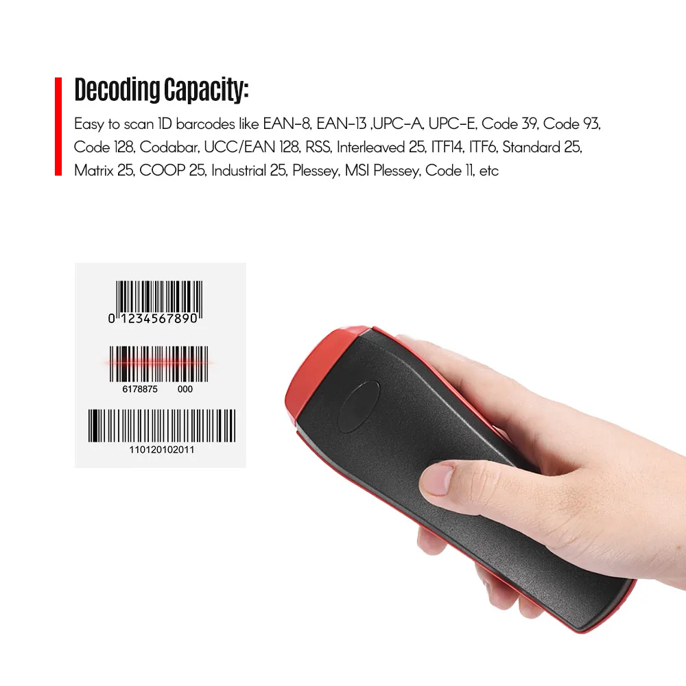 -1D: EAN-8, EAN-13 ,UPC-A, UPC-E, код 39, код 93, код 128, Codabar, UCC/EAN 128, RSS, Interleaved 25, ITF14, ITF6, Standard 25, матрица 25, COOP 25, Industrial 25, Plessey, MSI Plessey, Code 11 и т. Д.