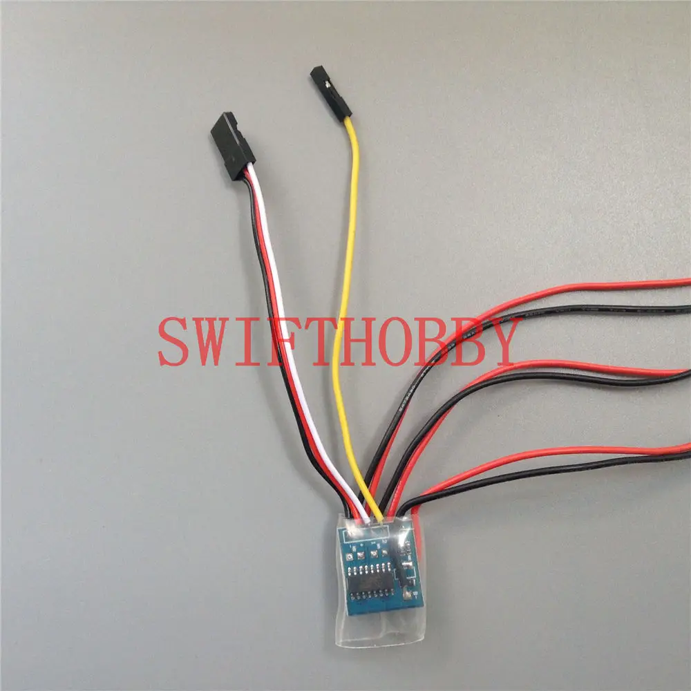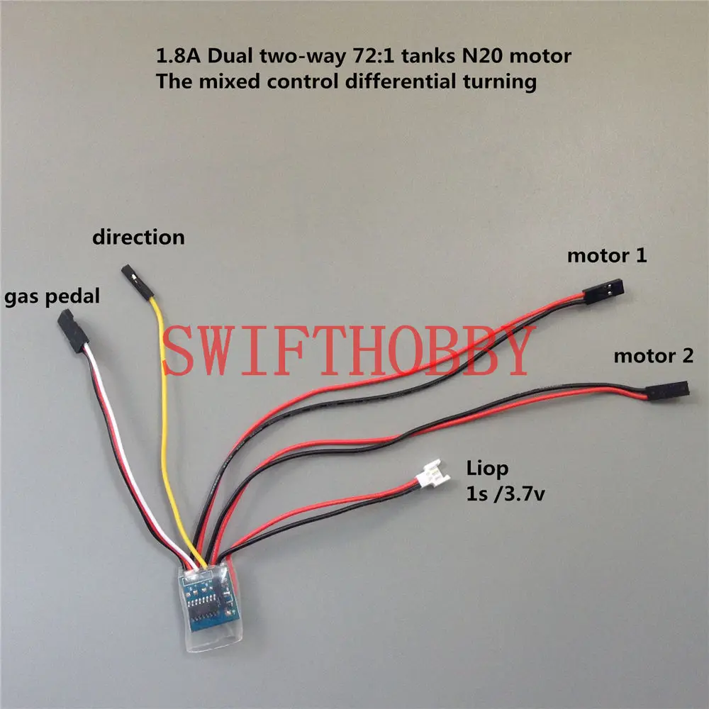 Description: 1.8A Brushed ESC Dual two-way Speed Controller 1:75 RC Tank 1S 3.7v N20 motor Electric current :1.8A Voltage :1s, 3.7v -6.5v Size: 16x18mm Features : Dual two-way ,mixed control, Differential turning (The motor can rotate forward and backward, and the tank can retreat.) This product, smaller size, 1S power supply Single road 1.8A, peak value 3.5A (generally the car of N20 deceleration unit is less than 1A, enough) The fixed position PWM 1500us (+50-50) in the remote control has the lowest run distance of 900-1100 and the highest 1900-2100 automatic adaptation, exceeding the neglect. Start with median point (throttle channel 1500, can hear the motor "Doodle", electrically adjustable start) With out-of-control protection (loss of signal (in the accident, the signal line is broken), in order to be safe and motor protection, it is necessary to return the throttle to the middle and re-unlock. Electric regulation has certain overcurrent and overheat protection Applicable voltage 2.9v-6.5v, with small white head battery (The power supply to the receiver is direct battery supply, and the electric regulation is also available at 2.9v, but the receiver may not be able to use it. The power supply mode is battery direct regulation/actuator/receiver power supply (three + - are connected) But when the motor rotates (current < 2A, 1S battery has voltage drop (e.g. 0.3v), it will not affect the servo/receiver power supply at this time; but if the motor current is large (3A), it may affect. (The default is mixed control, just connect the remote control throttle and steering)