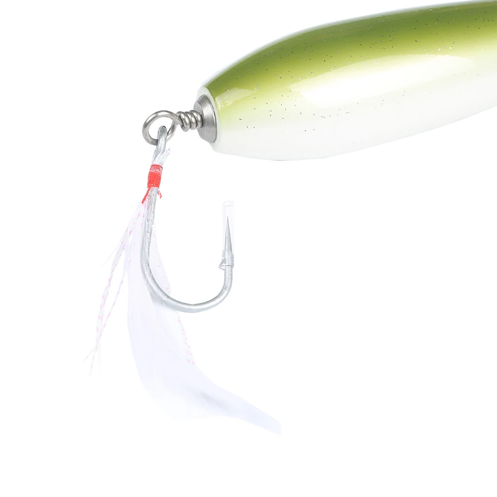 Wood topwater lures with saltwater-grade X5 quality high carbon steel hooks. The hooks fixed with super strong split rings and heavy-duty swivel. Hook is with feather just like fly tying yarn crystal flash.