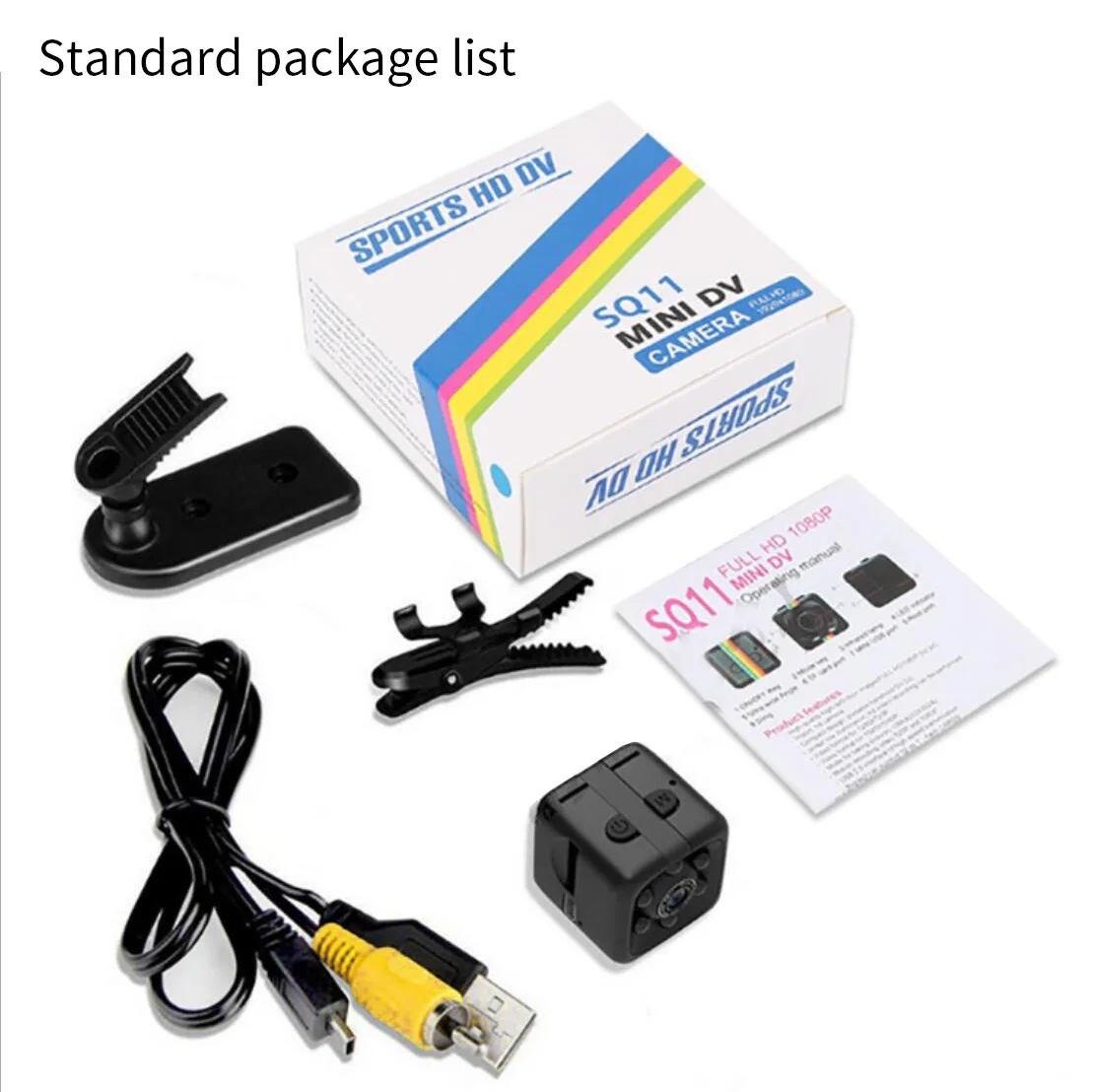 1 х мини-автомобильная dvr камера, 1 х USB/ТВ из кабель 2 в 1, 1 х кронштейн 1 х клип 1 х Руководство пользователя на китайском и английском языках 1 x Упаковка для розничной торговли 1x32G sd-карта (опционально) 1 x защитный чехол (опционально)