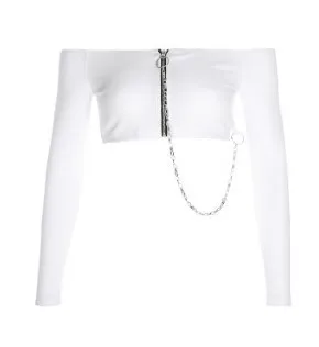 Осенняя мода, Ребристая белая футболка, женская футболка с открытыми плечами, металлическая цепочка, молния, длинный рукав, Осенний Топ, сексуальные рубашки, укороченные